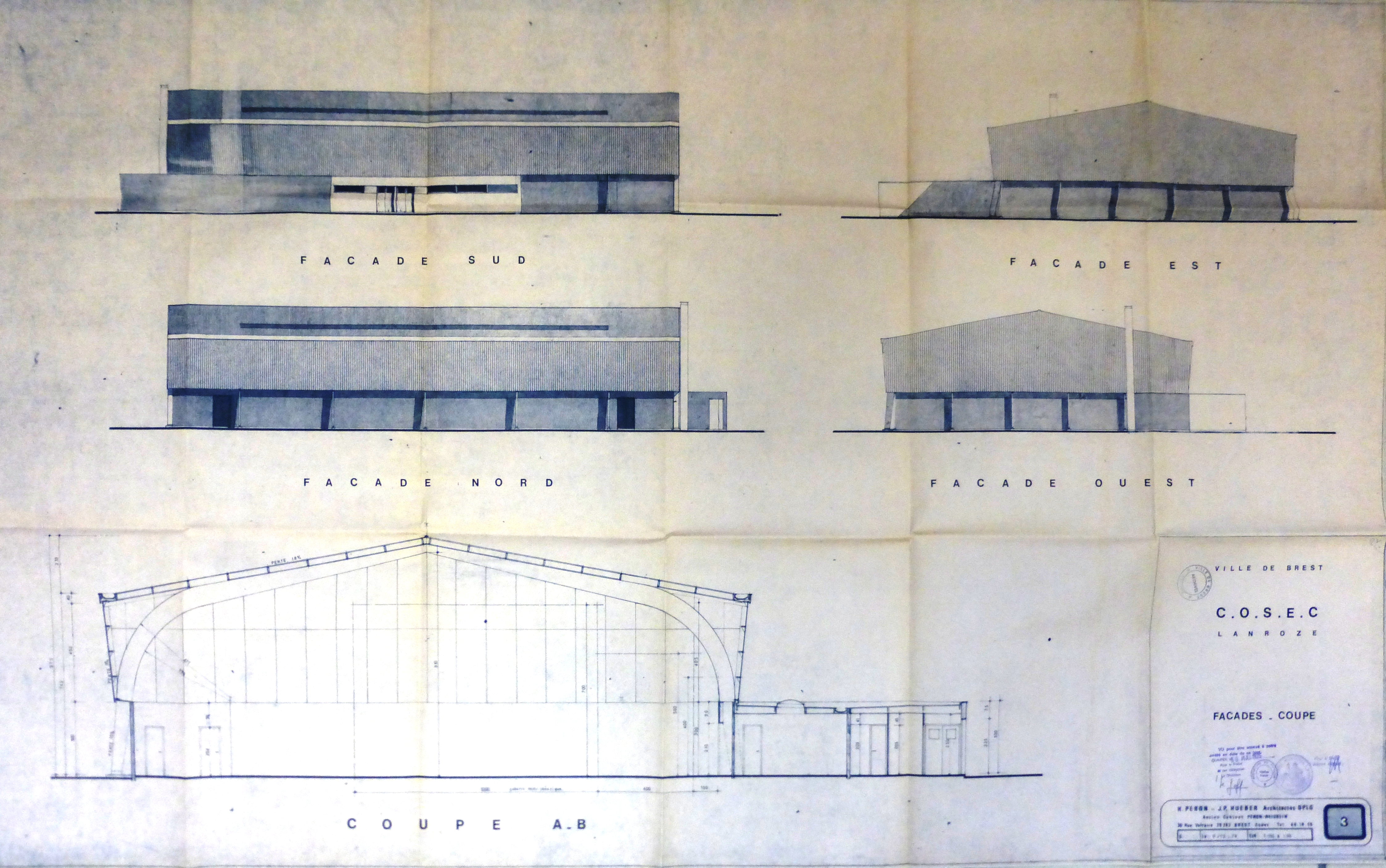 AC Brest : 4 M 200. Façades et coupe. H. Péron et J.-P. Hueber, 1974.