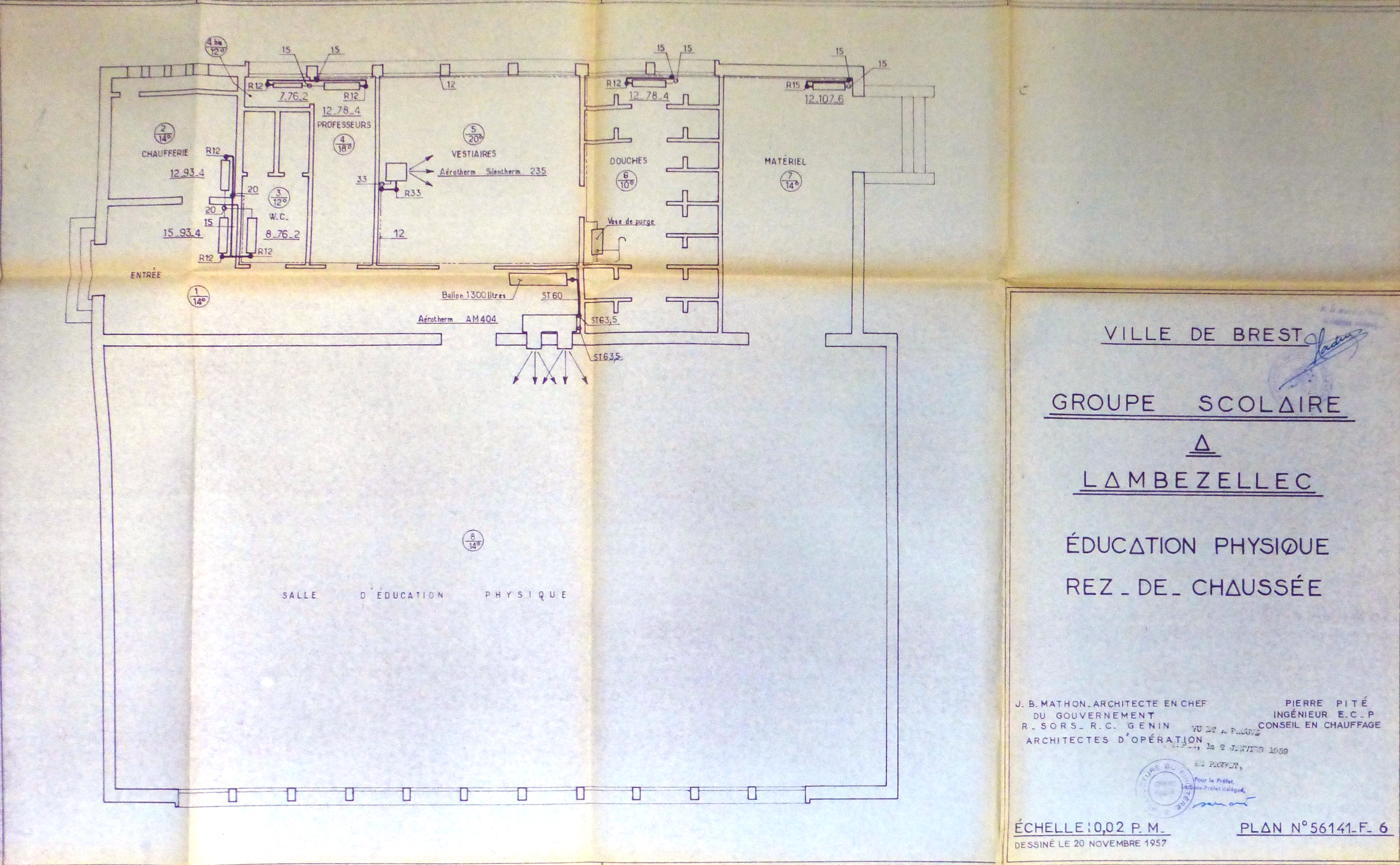 AC Brest : 242 W 27. Plan de la salle d'éducation physique. Jean-Baptiste Mathon, 1957.