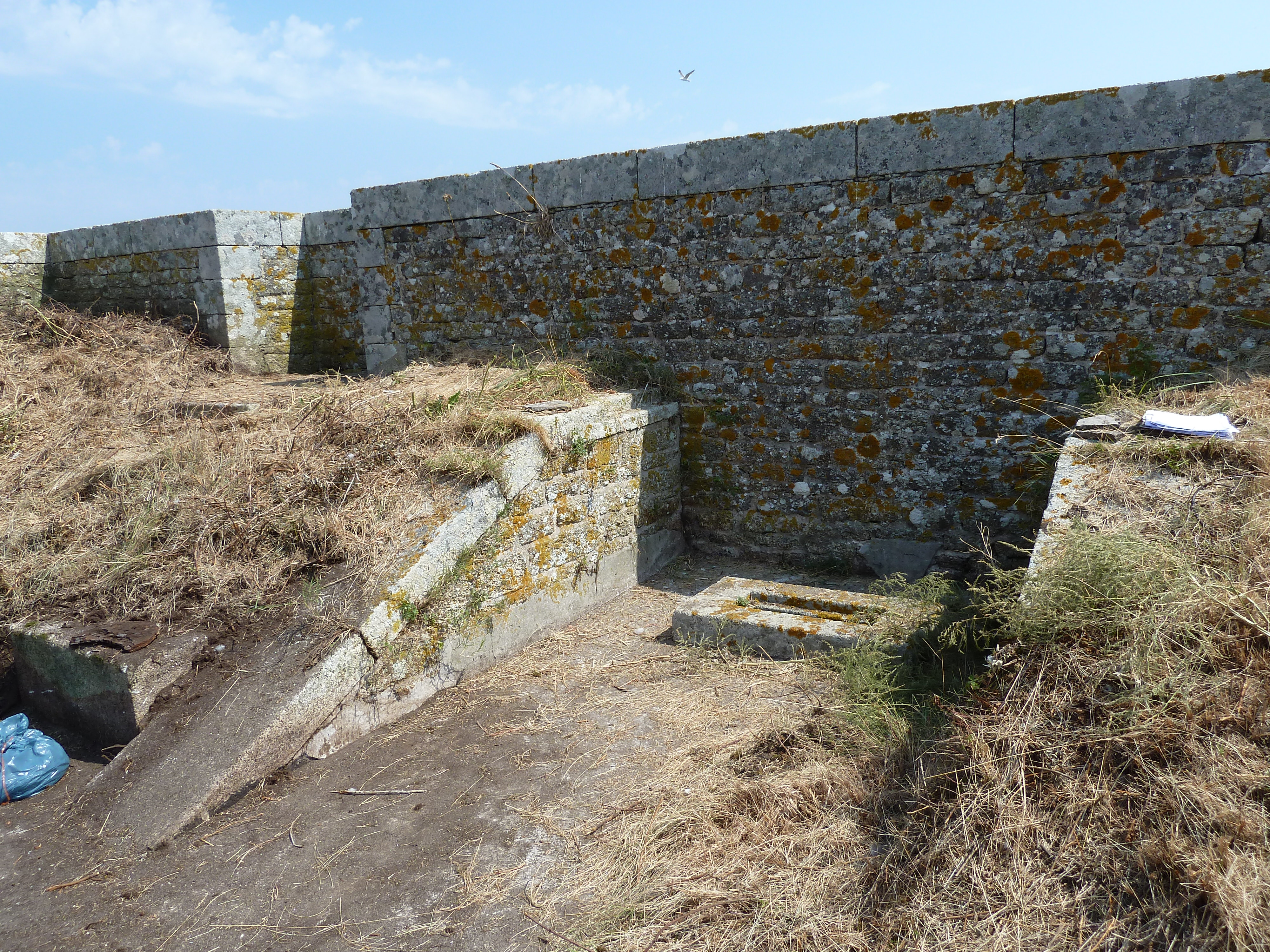Archipel de Glénan, batterie de Penfret, corps de garde crénelé, la terrasse avec ses banquettes en terre en 2013.Immatriculation