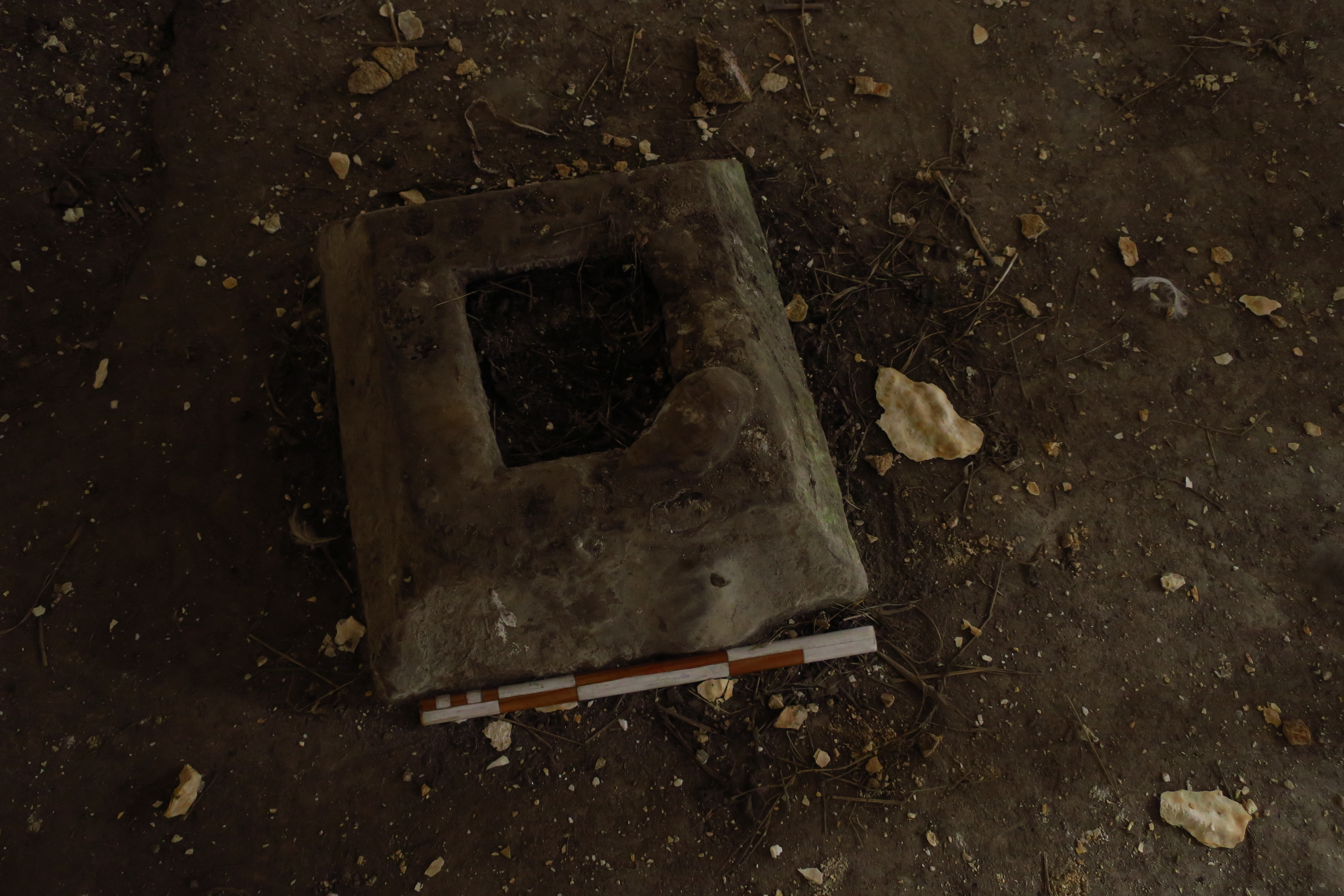 Archipel de Glénan, batterie de Penfret, corps de garde crénelé, détail d'un plot de poteau de support de hamacs.Immatriculation