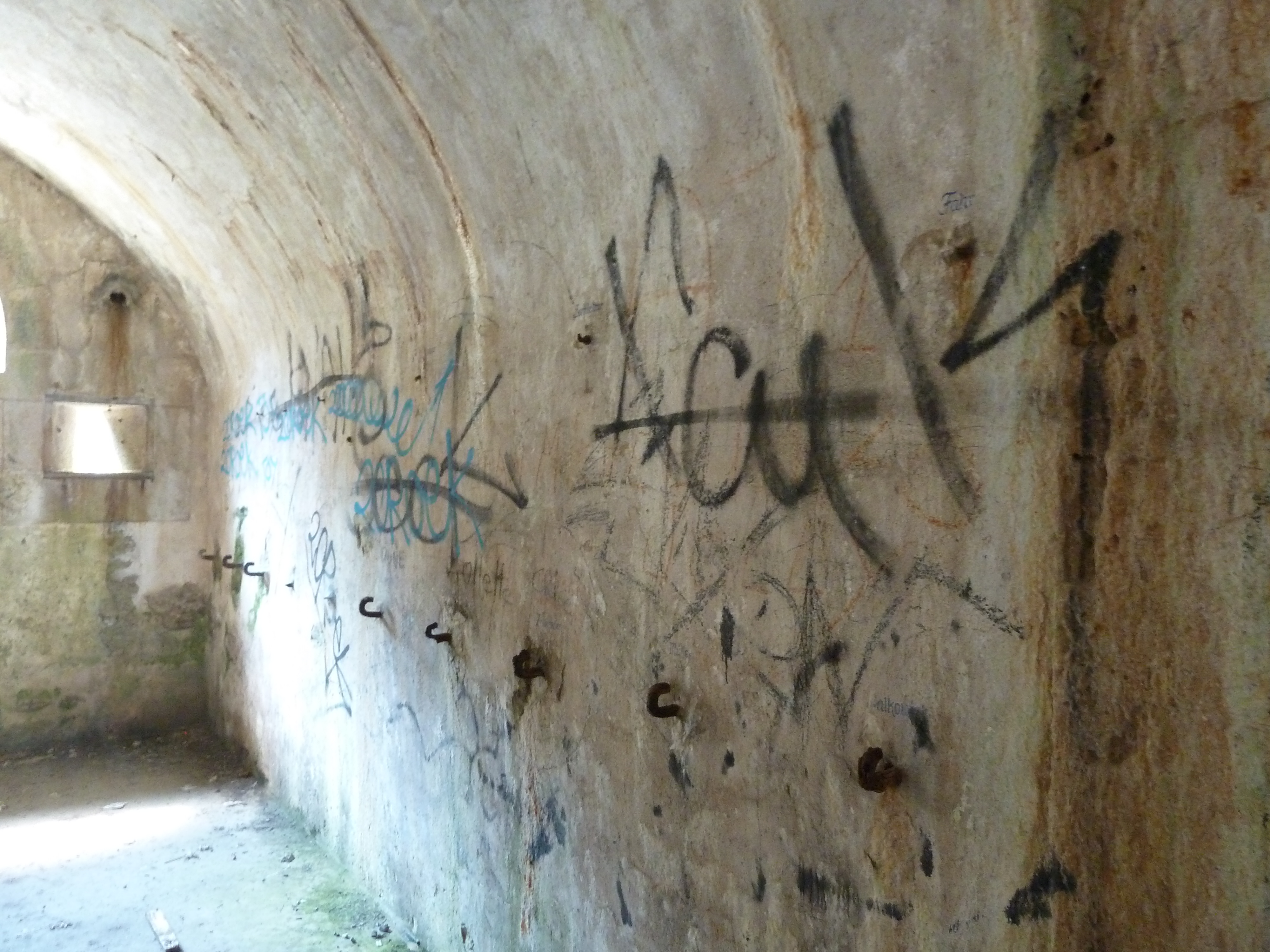 Archipel de Glénan, batterie de Penfret, corps de garde crénelé, crochets de hamacs et inscriptions allemandes dans une chambrée.Immatriculation