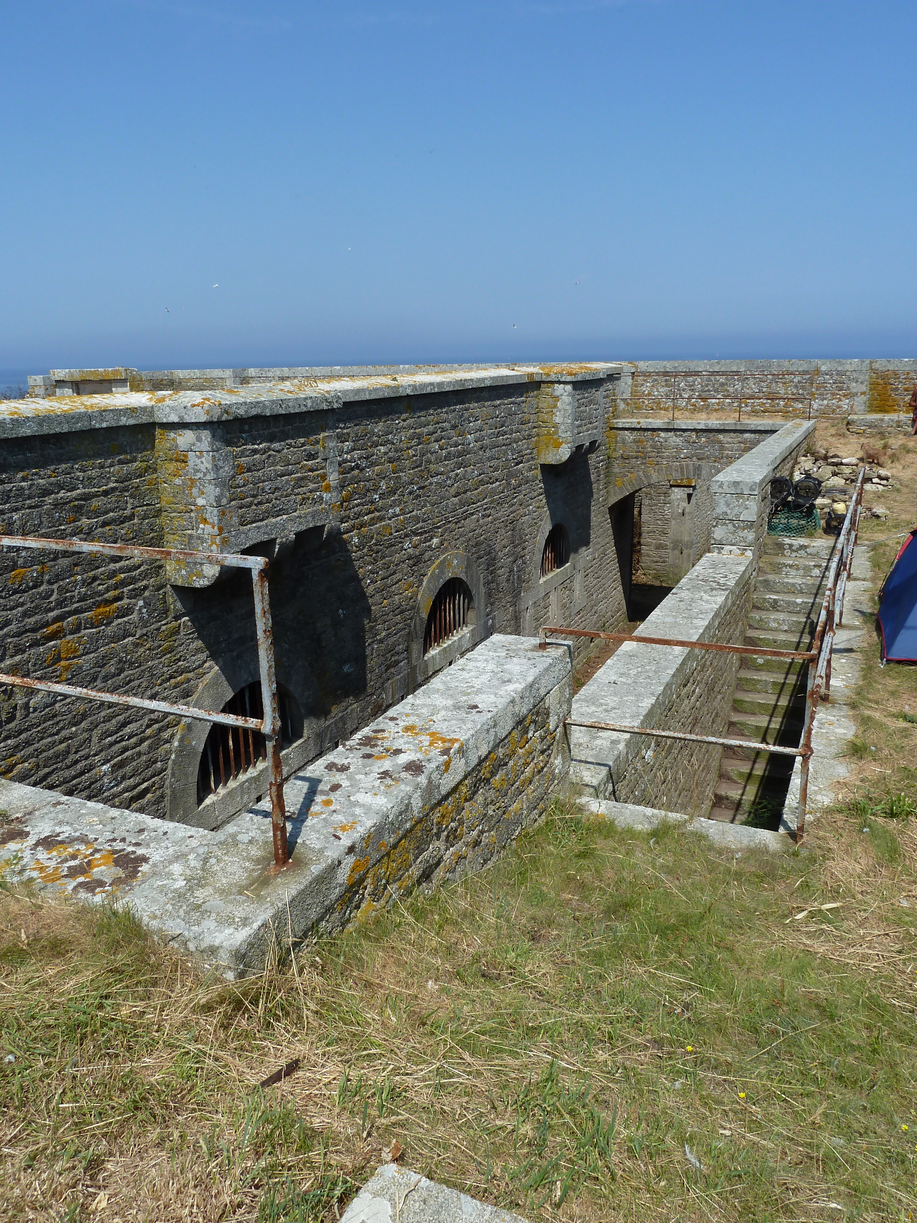 Archipel de Glénan, batterie de Penfret, réduit, jonction du corps de garde crénelé avec l'enceinte du phare.Immatriculation