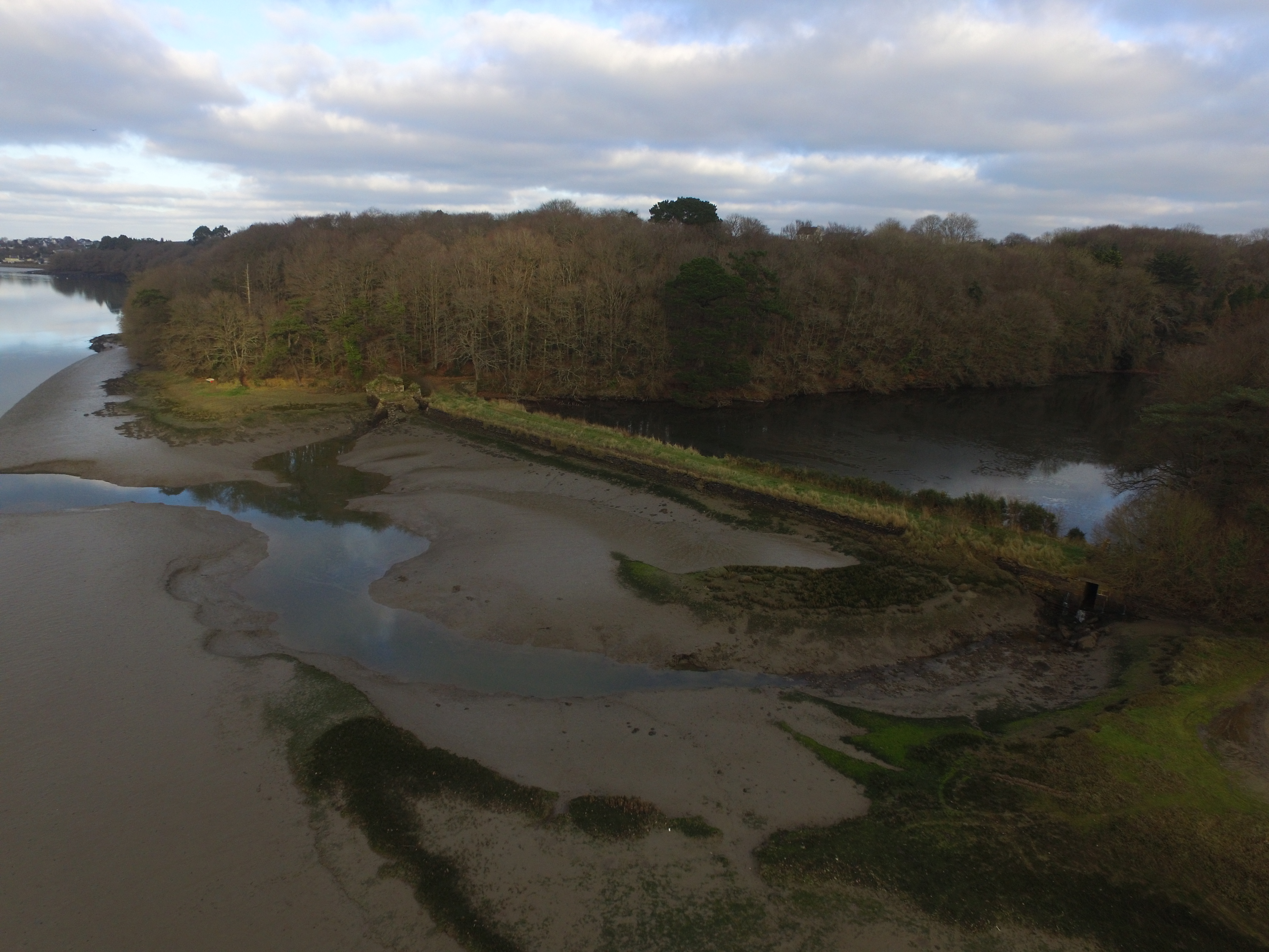 Vue du ciel : la Penzé, le moulin, digue et étangImmatriculation