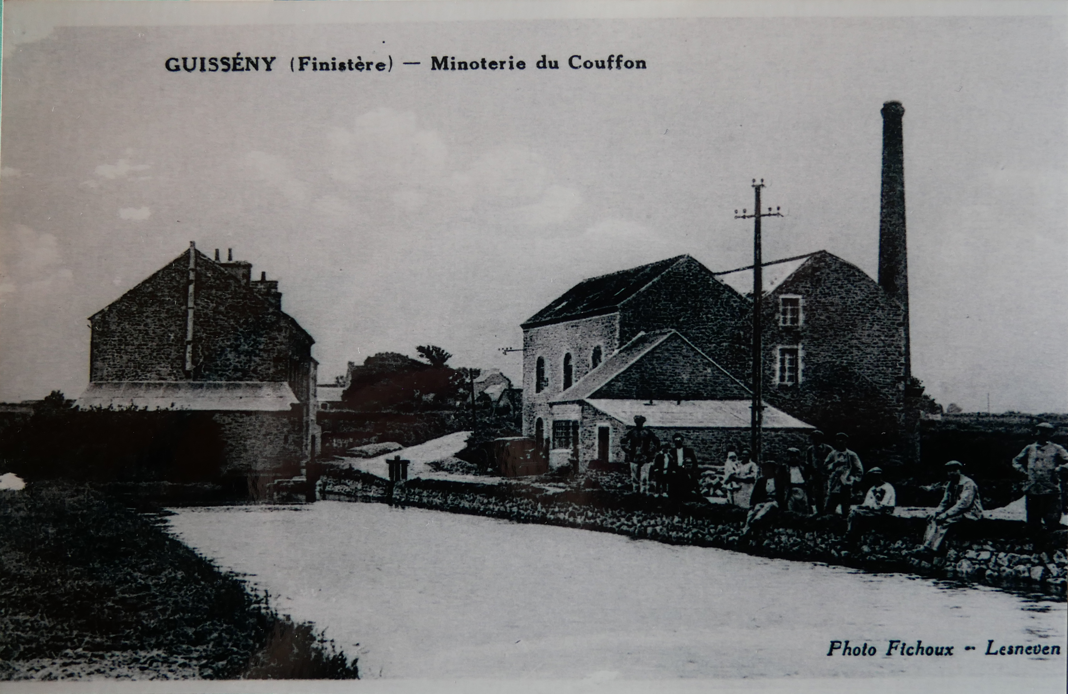 Carte postale, "Guissény (Finistère), Minoterie du Couffon", Ed. Photos Fichoux, façade nord et est, vue depuis l'étang, avant 1935Immatriculation