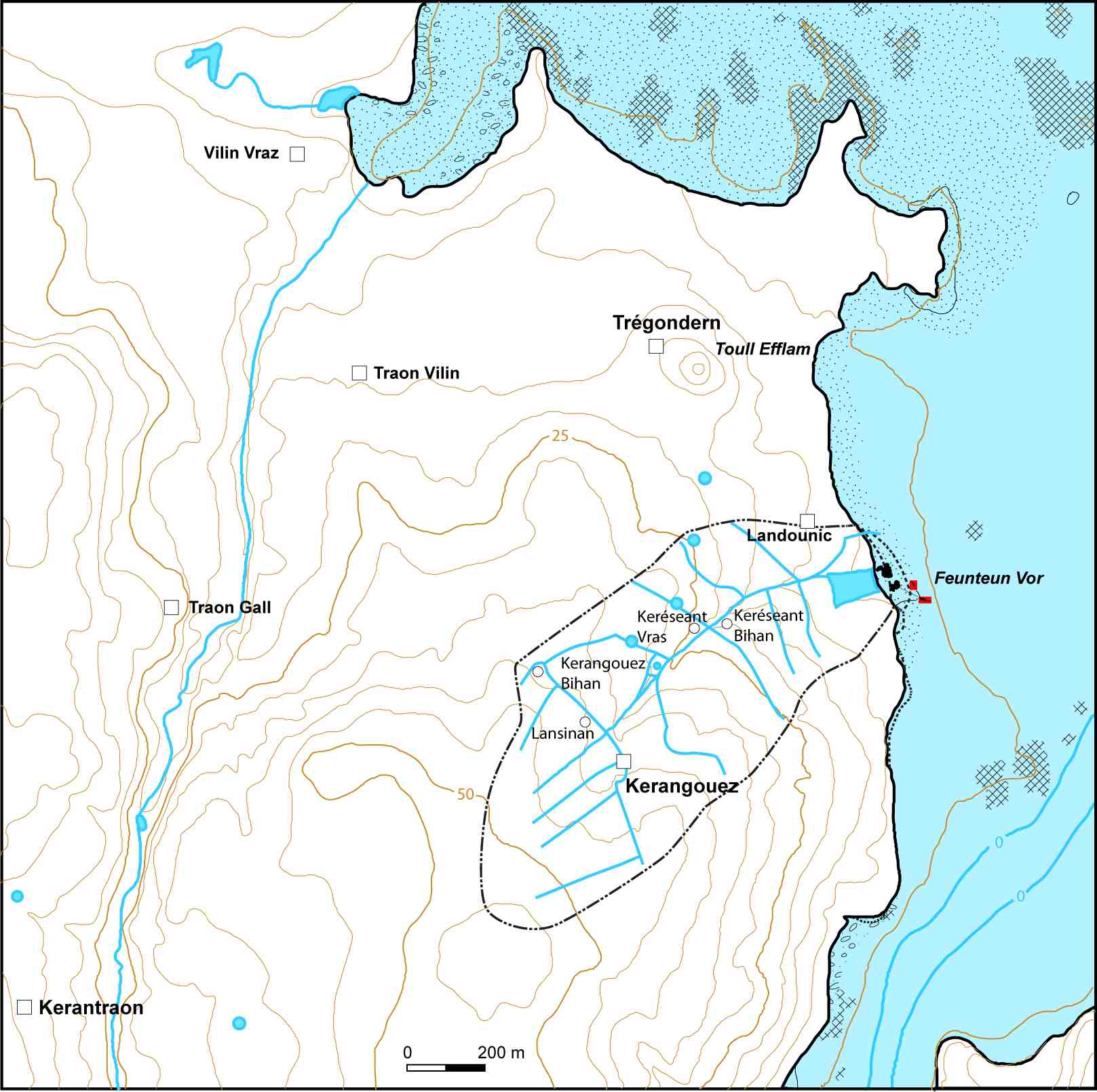 Carte synthétique des données hydrologiques sur le petit bassin versant dominant les structures archéologiques (en rouge) sur l’estranImmatriculation