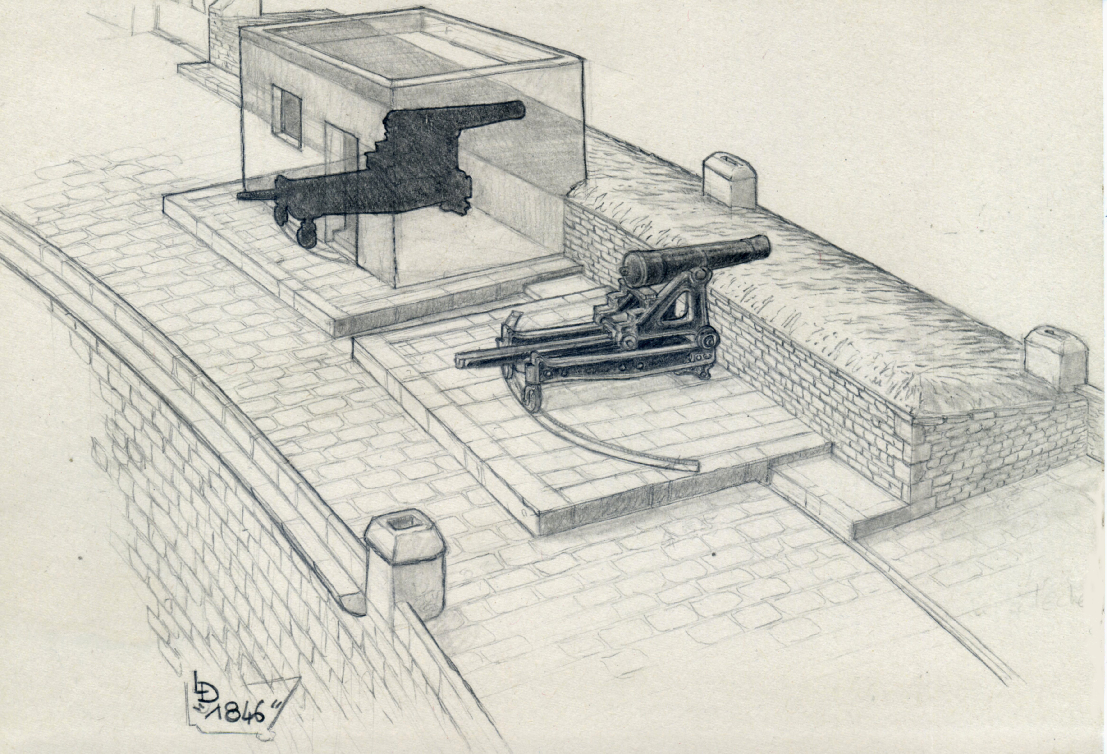 Archipel de Glénan, fort de l'île Cigogne, batterie Ouest, évocation de l'état vers 1860 avec l'artillerie en place, par Lionel Duigou.Immatriculation