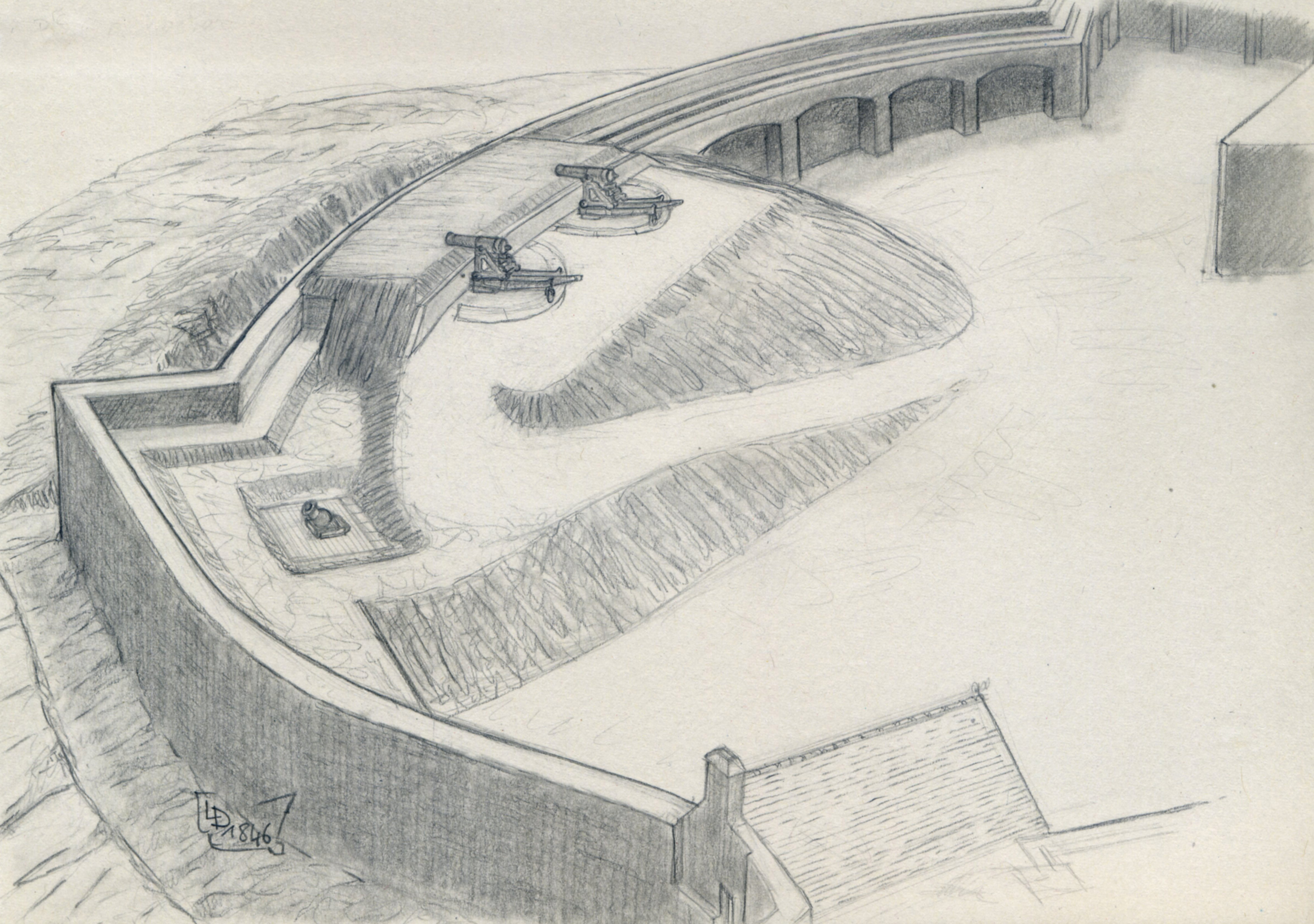Archipel de Glénan, fort de l'île Cigogne, batterie Est, évocation de l'état vers 1870 avec l'artillerie en place, par Lionel Duigou.Immatriculation