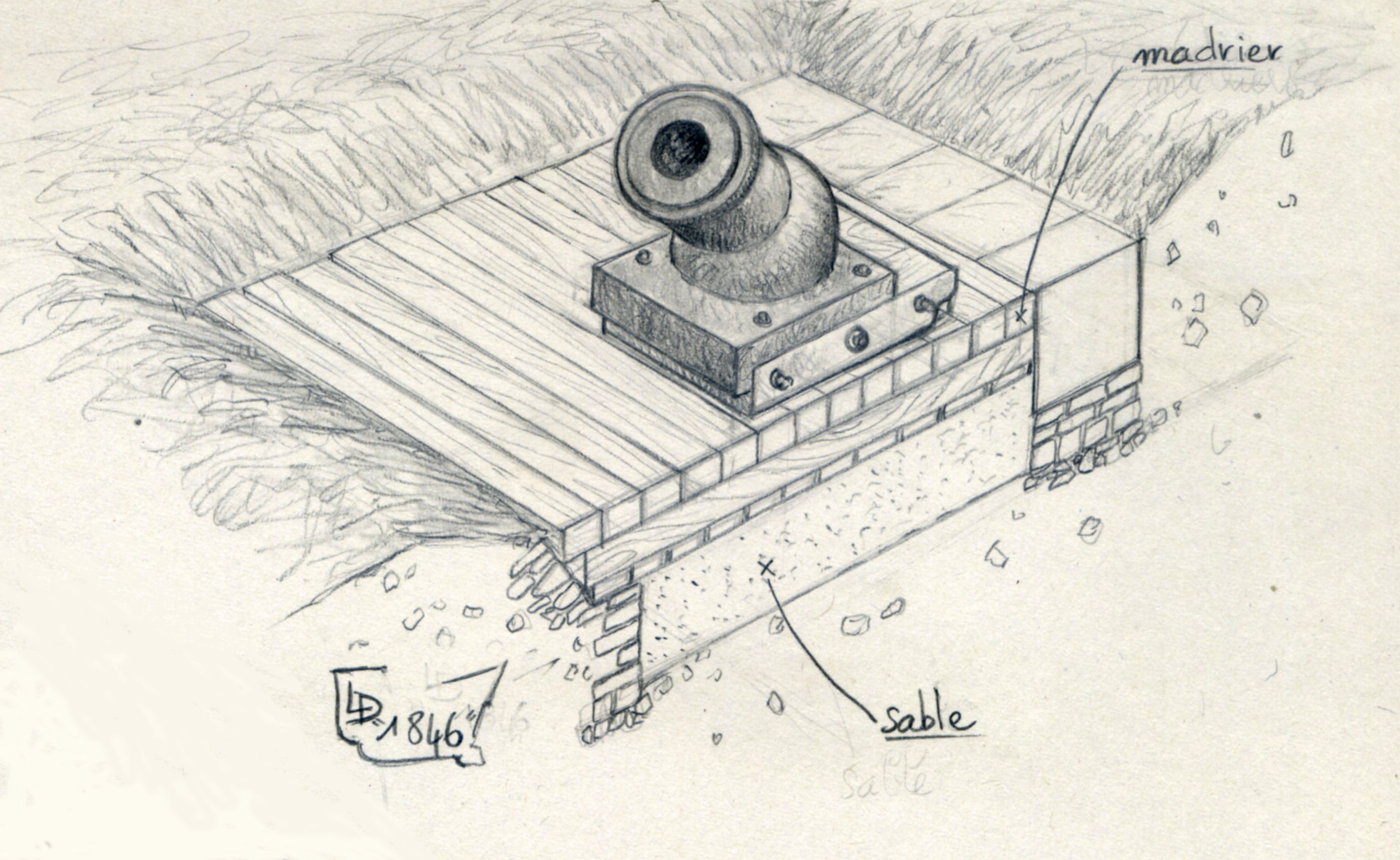 Archipel de Glénan, fort de l'île Cigogne, batterie Est, évocation de la plate-forme pour mortier vers 1870, par Lionel Duigou.Immatriculation