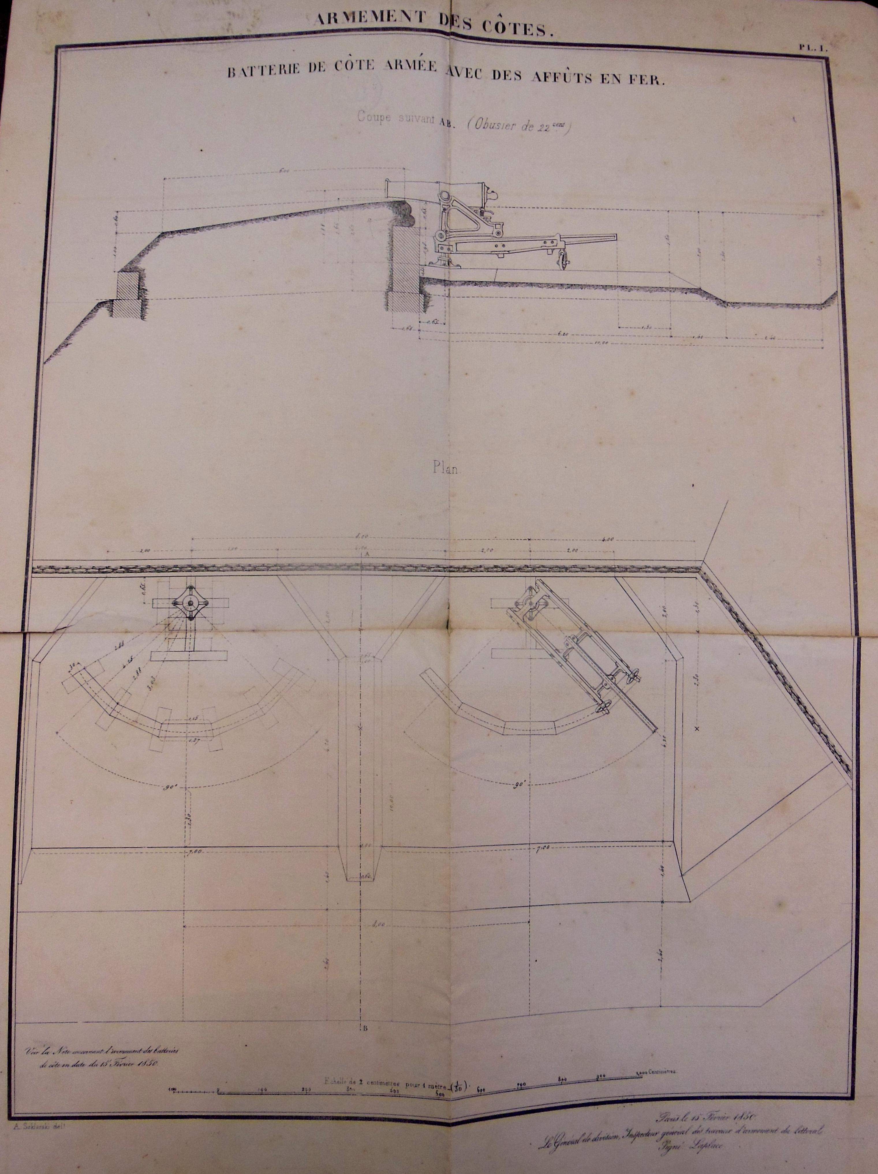 Service historique de la Défense, Département Marine, Lorient. Archives de la Place et du Génie de Belle-Île-en-Mer ; Sous-série 4 S2, archives du Génie de Belle-Île-en-Mer : 4 S2 8, Ministère de la Guerre, Inspection générale de la défense des côtes, Instruction sur les batteries de côte, 15 février 1850.