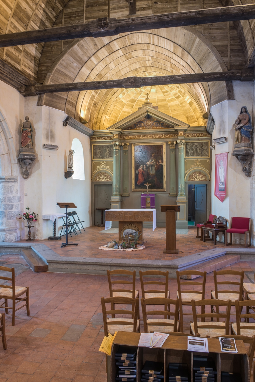 Vue du choeur et de la voûte lambrissée en chêne en plein cintreImmatriculation