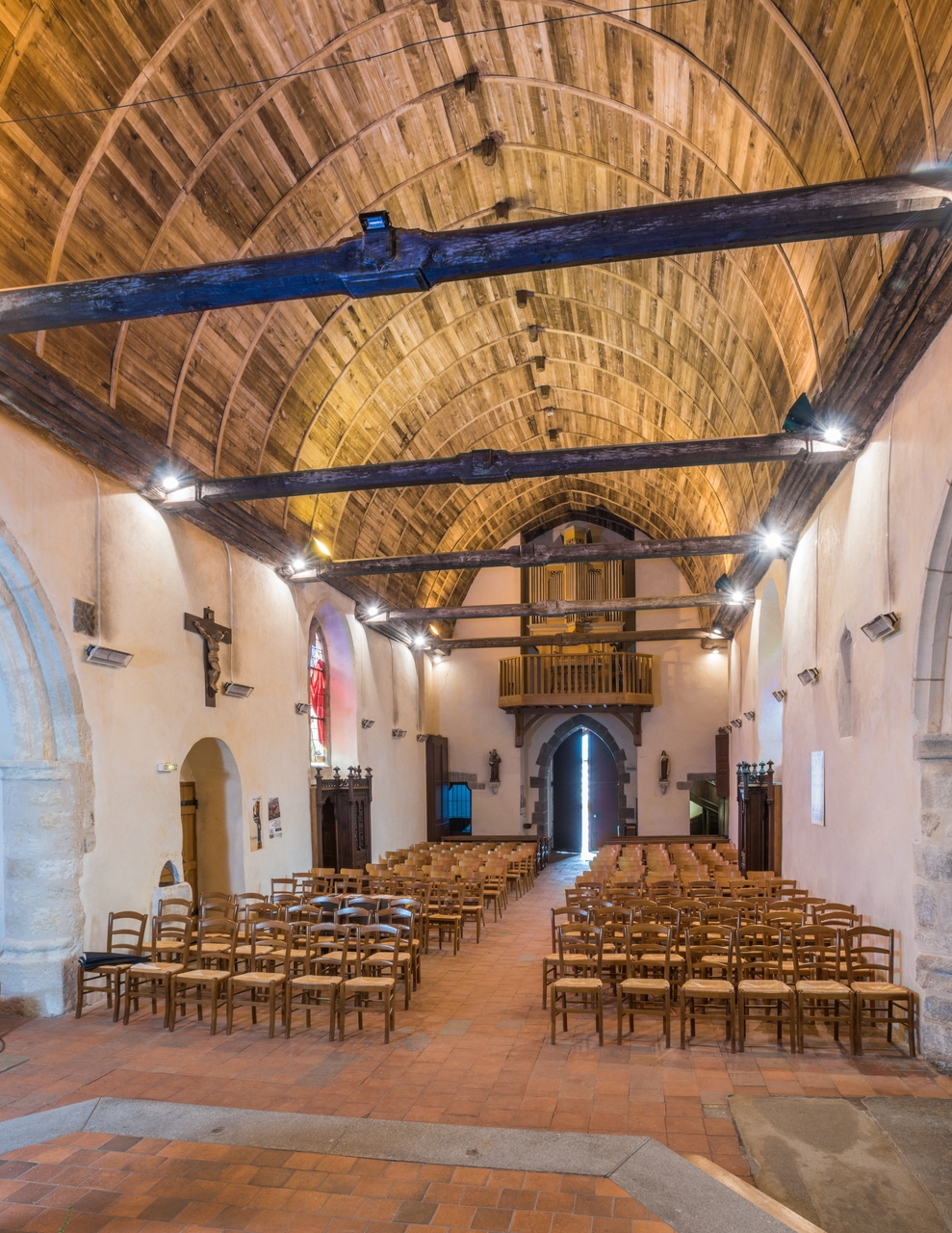 Vue de la nef et de sa voûte lambrissée en chêne en plein cintreImmatriculation