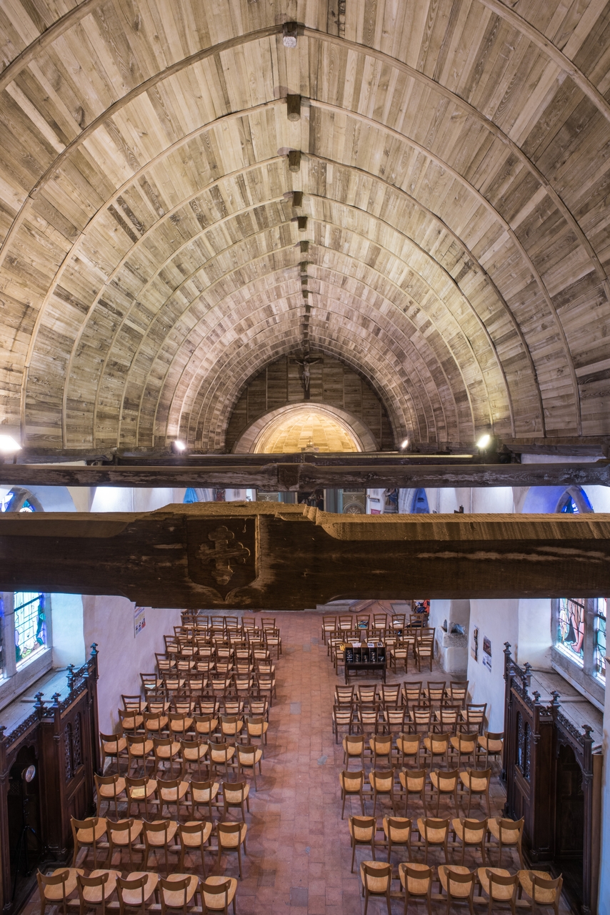 Vue de la voûte lambrissée en chêne et des blasons présents sur les entraits (vue depuis l'Ouest)Immatriculation