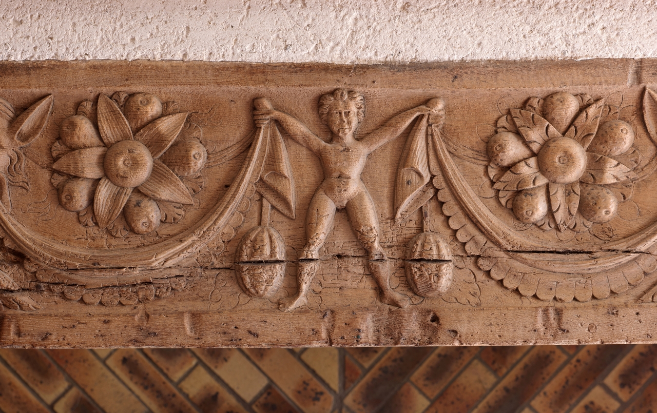 Les Barberais : vue générale de la cheminée dans la cuisine, détails linteau, partie centraleImmatriculation