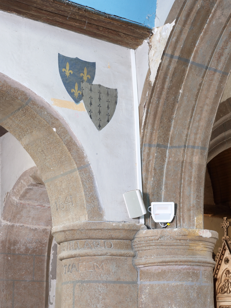 Vue depuis le choeur : détail armoiries et inscriptionImmatriculation