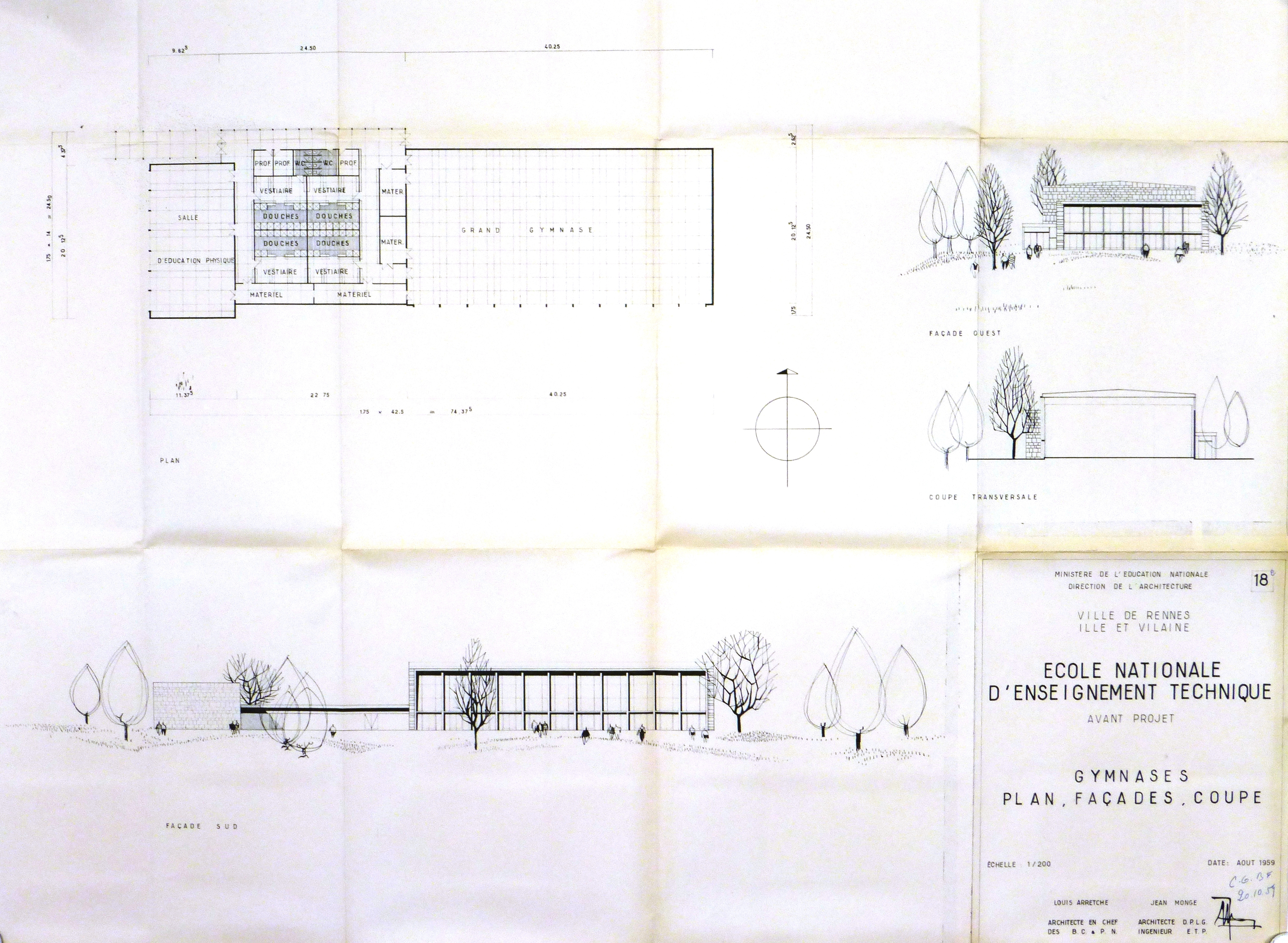 AN : 19771564/33. Gymnases : plan, façades, coupe. L. Arretche & J. Monge, 1959.