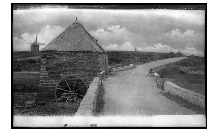 Moulin à marée équipé de sa roue ; en arrière plan moulin à vent, Le HézoImmatriculation