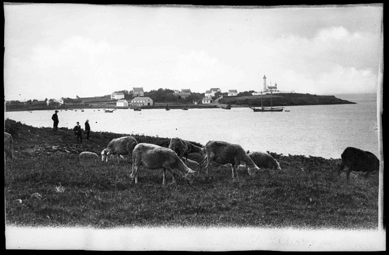 La pointe et la rade de Port-Navalo, vue prise du village du Monteno ; troupeau de vaches en premier plan, ArzonImmatriculation