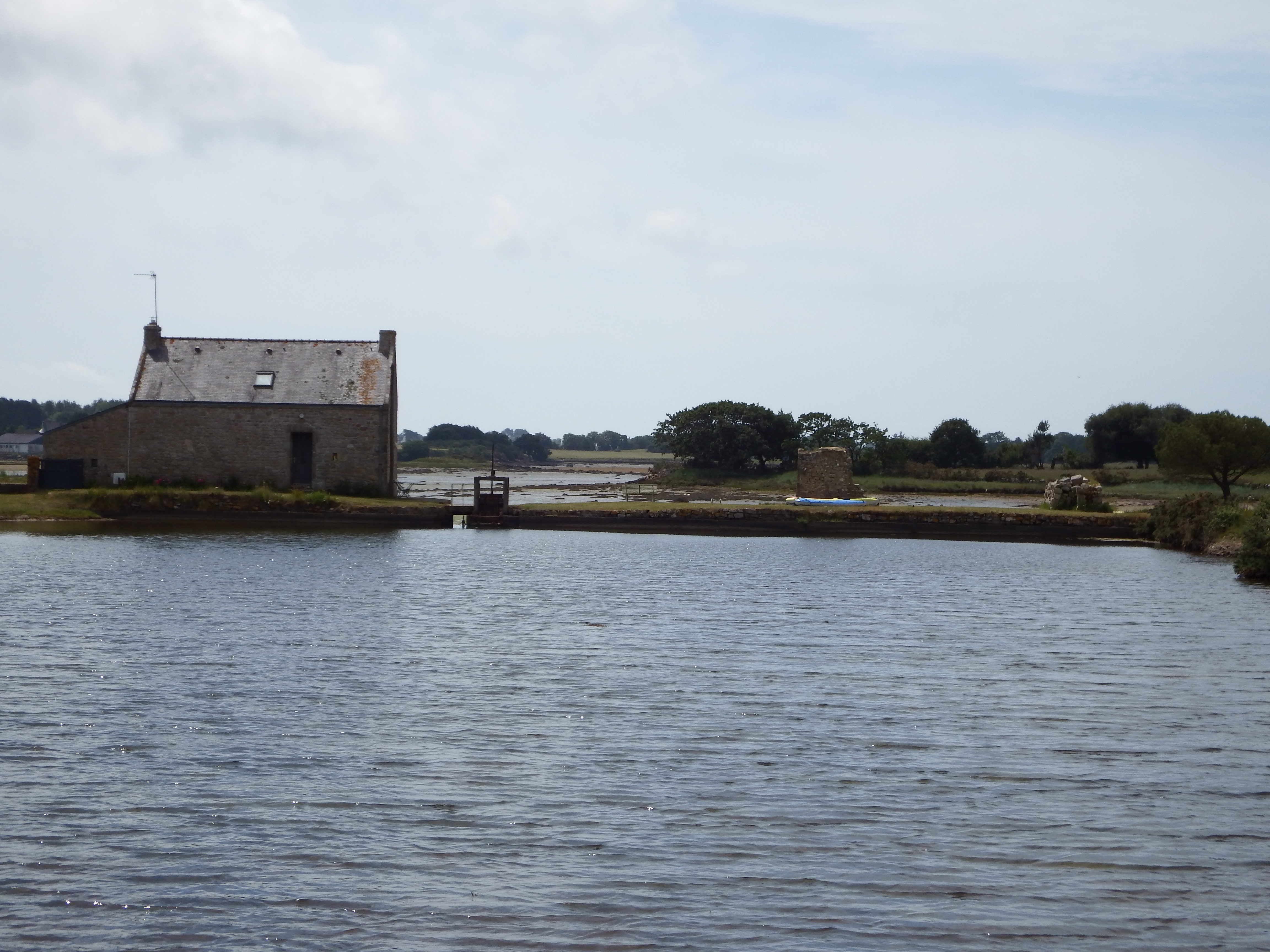 Vue depuis les rives de l'étang, de gauche à droite : la maison du meunier, la porte à mer, ruines du moulinImmatriculation
