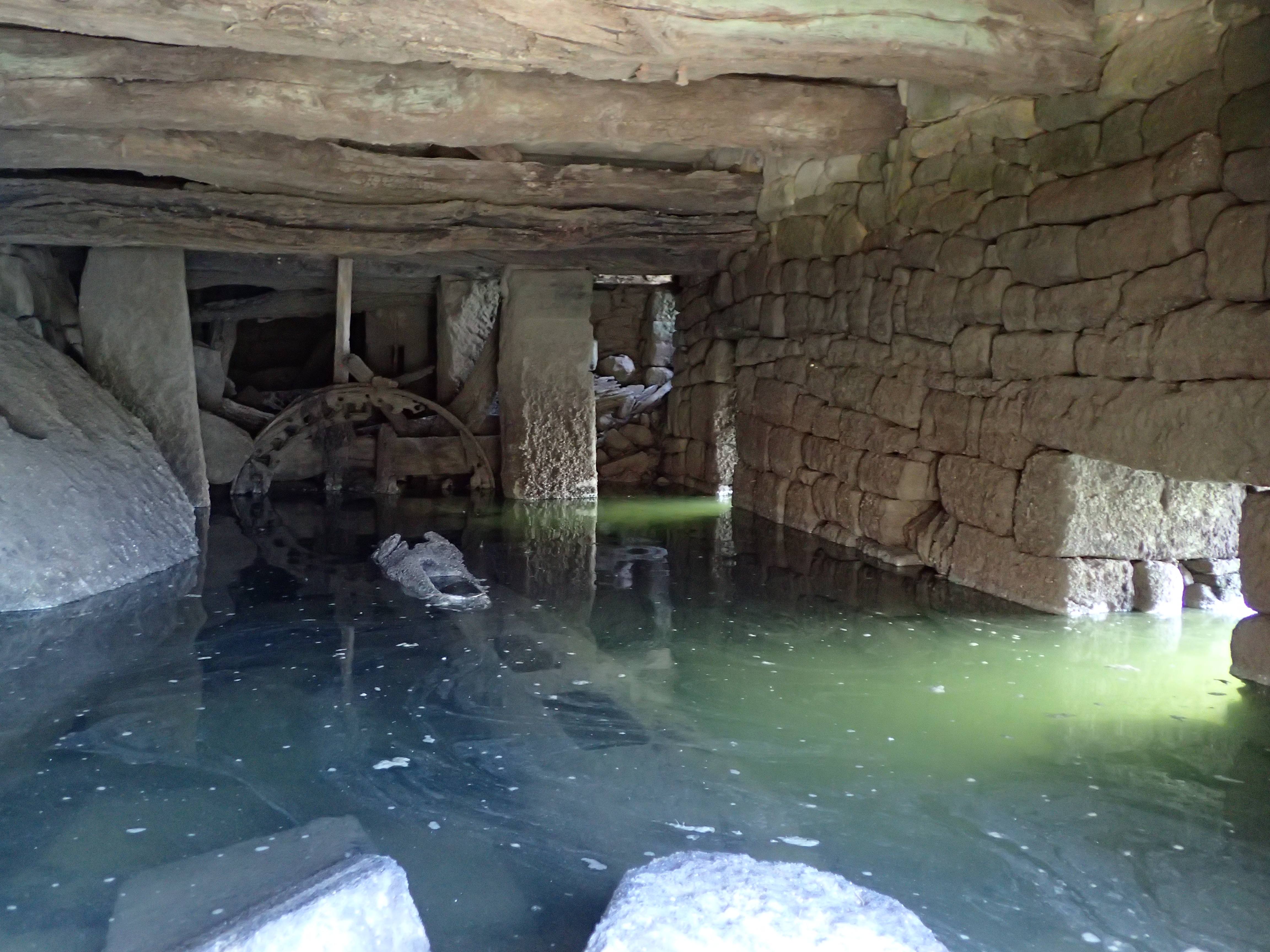 Sous-sol du moulin : ancienne meule, arbre de la roue et rouet au fondImmatriculation