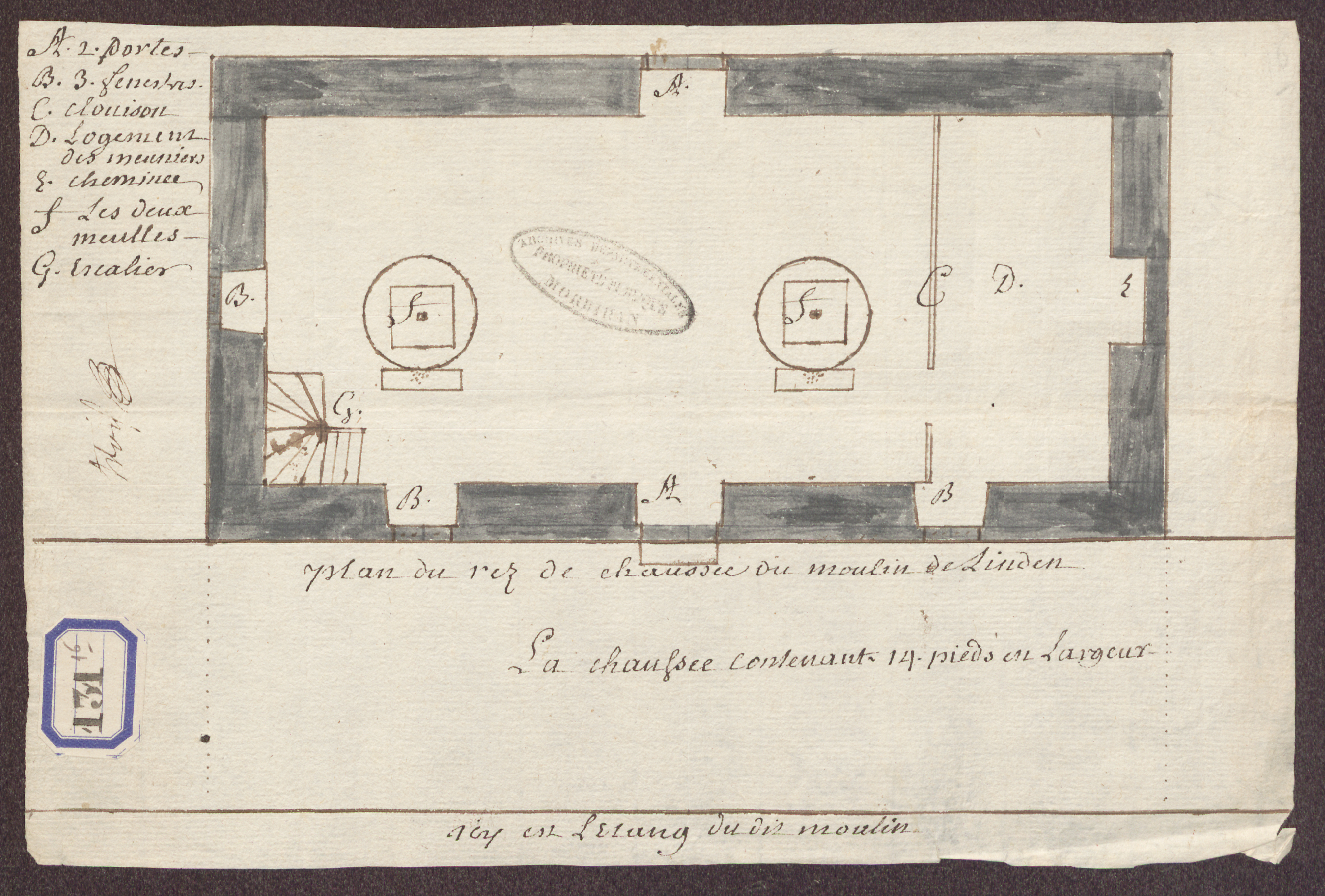 Plan du rez-de-chaussée du moulin du Lindin, AD56 1Fi 131/16, dation estimée 18eImmatriculation