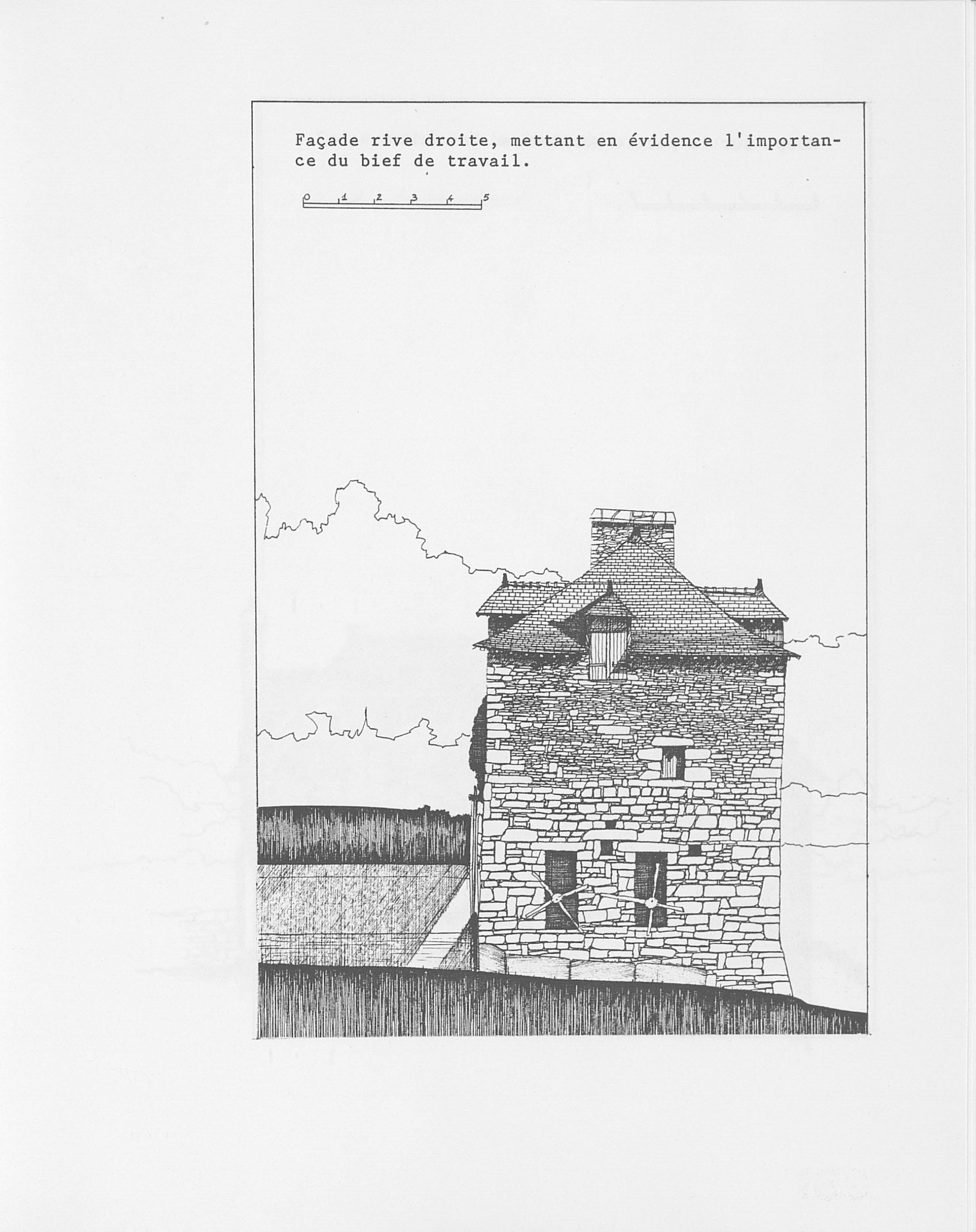 Dessin J-L. Rousseau, TPFE Ecole Nationale Supérieure d'Architecture de Nantes (1985), Façade rive droite avec bief completImmatriculation