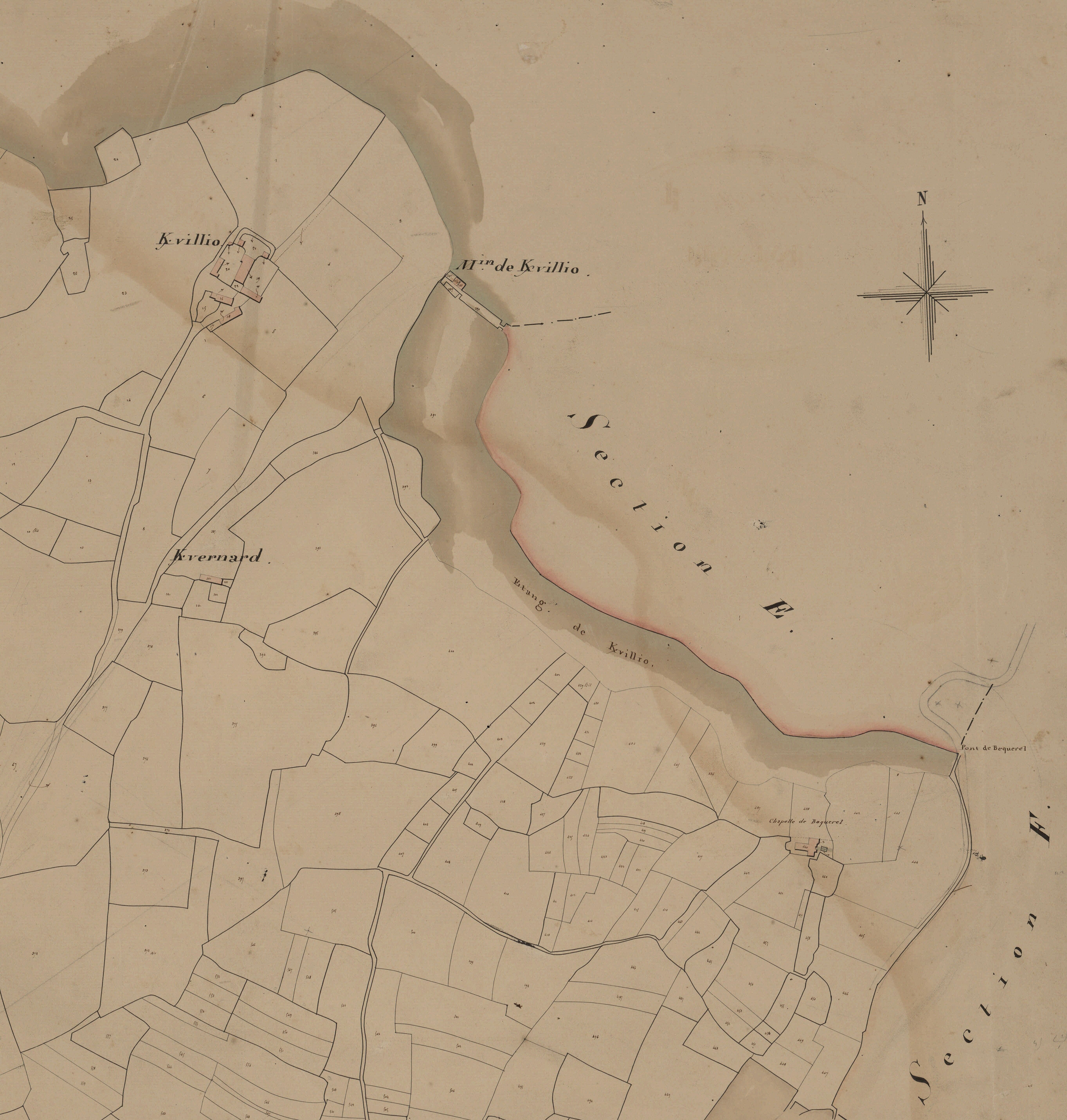 Cadastre de 1831 (Plougoumelen), Le moulin de Kervilio et son étang, 3 P 213/19 - Section I de Kervennec, 1re feuille, échelle 1/2 500, parcelles n° 1-606Immatriculation