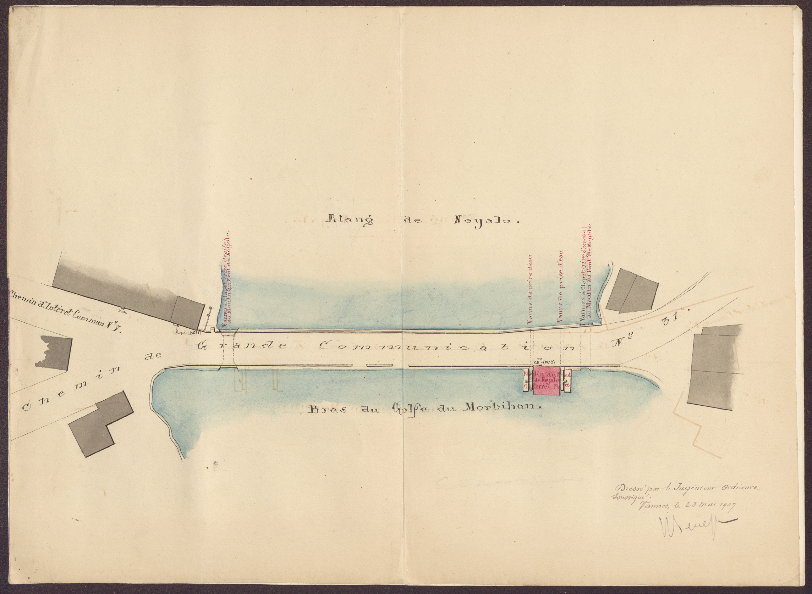 Plan aux abords du moulin, extrait du réglement d'eau du moulin de Noyalo, AD56 7S112 (1907)Immatriculation