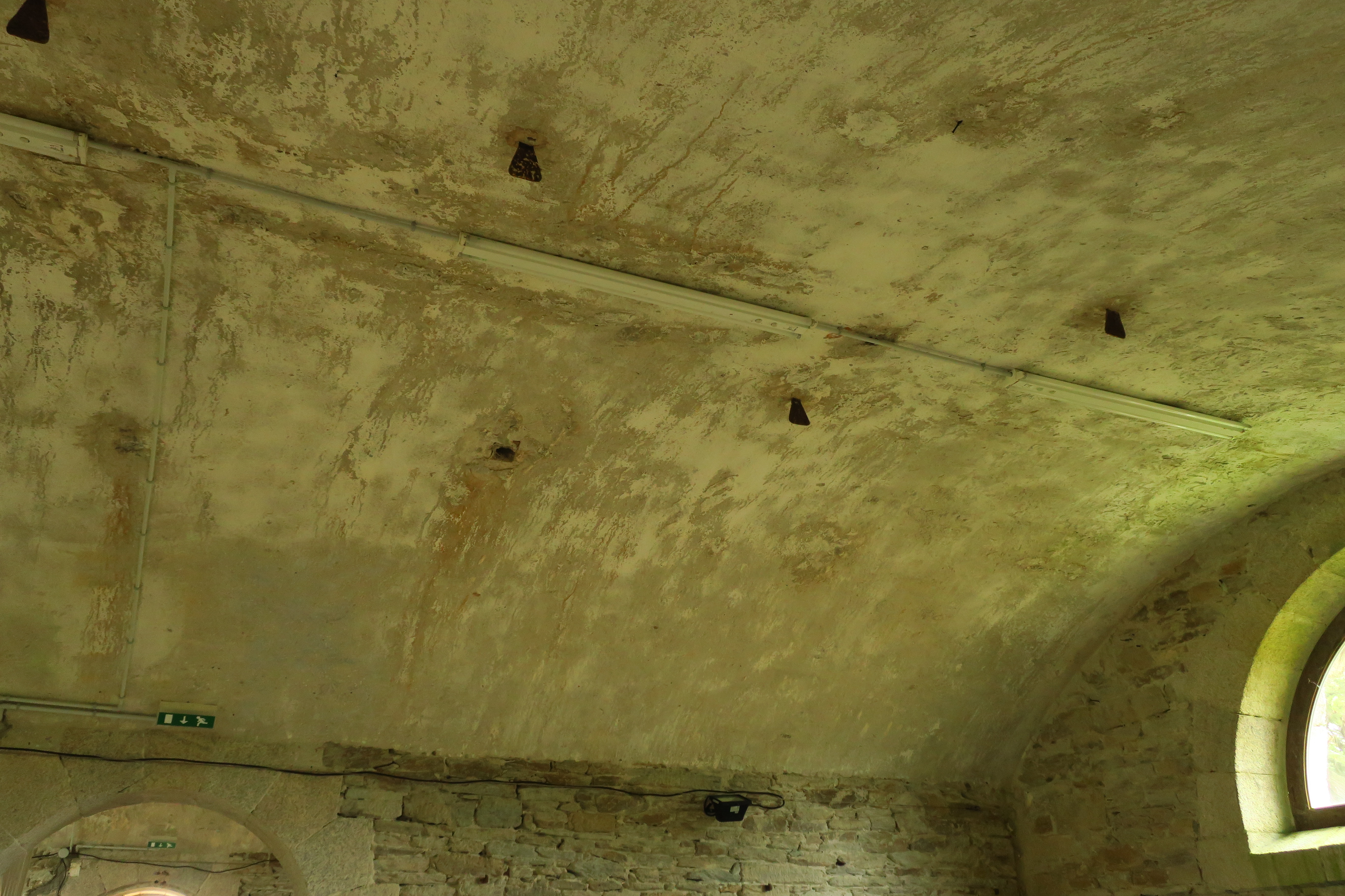 Groix, batterie du Gripp, corps de garde crénelé, accroches de poteaux de hamacs dans la voûte d'une chambrée .Immatriculation