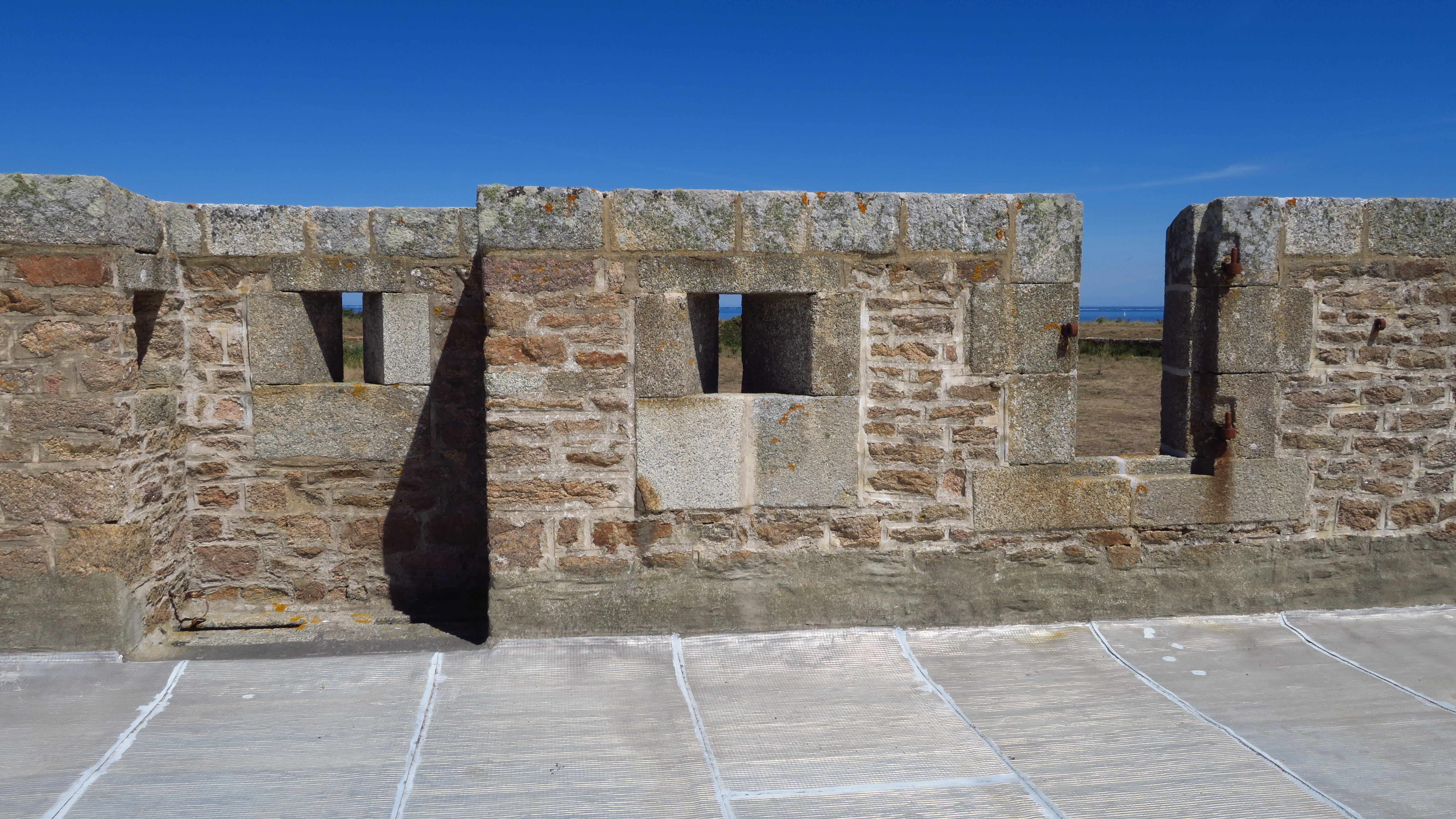 Île-d'Houat, batterie du Béniguet, corps de garde crénelé, détail du parapet de la terrasse.Immatriculation