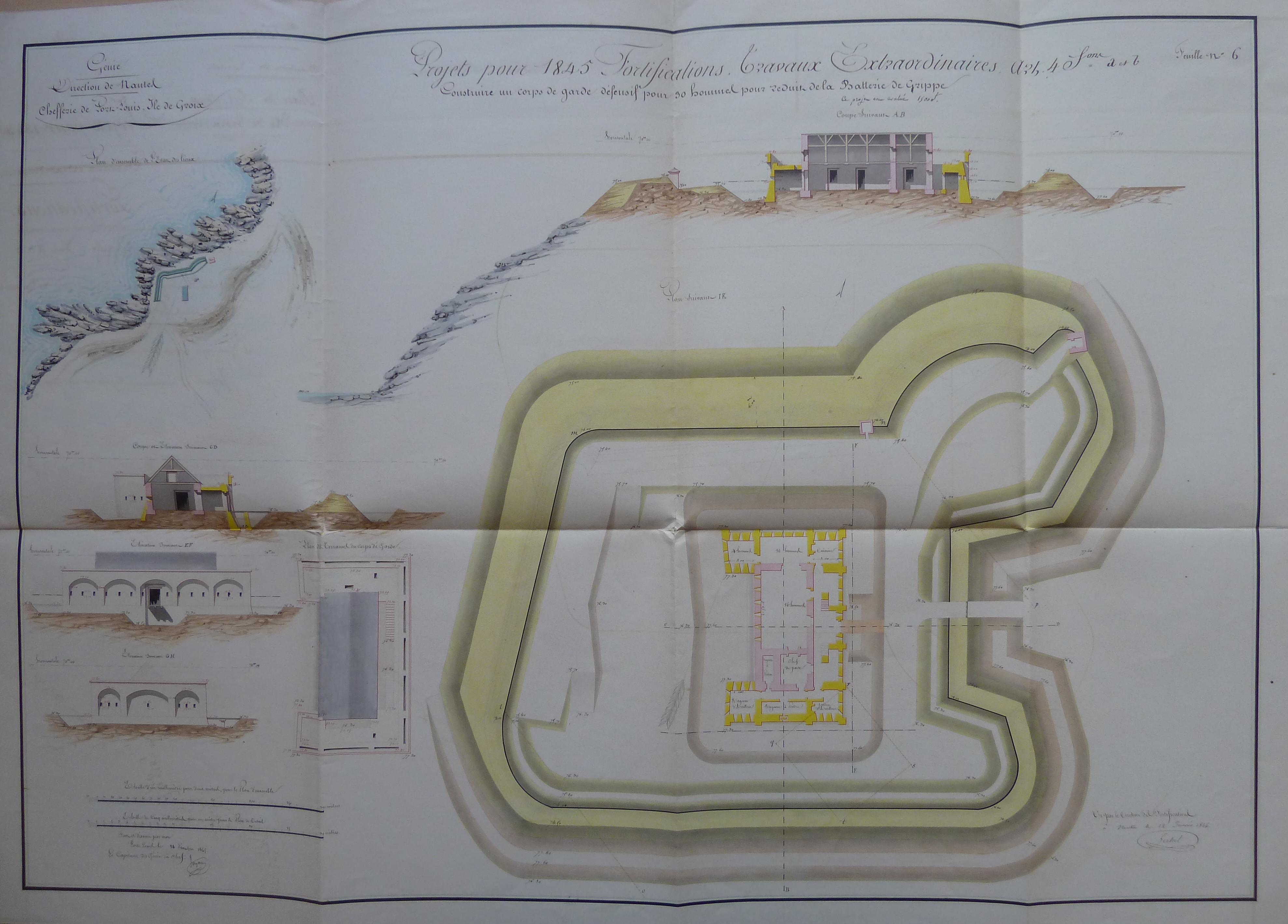 Service historique de la Défense, département Armée de Terre, Vincennes. Archives du Génie ; Article 8, Places françaises et d'Algérie : 1 VH 1473, Place de Port-Louis, projets et dépenses annuels, 1835-1846. Direction du Génie de Nantes, Place de Port-Louis, feuille n° 6 des projets extraordinaires pour 1845, construire un corps de garde défensif pour 30 hommes pour réduit de la batterie de Grippe, 28 décembre 1845.