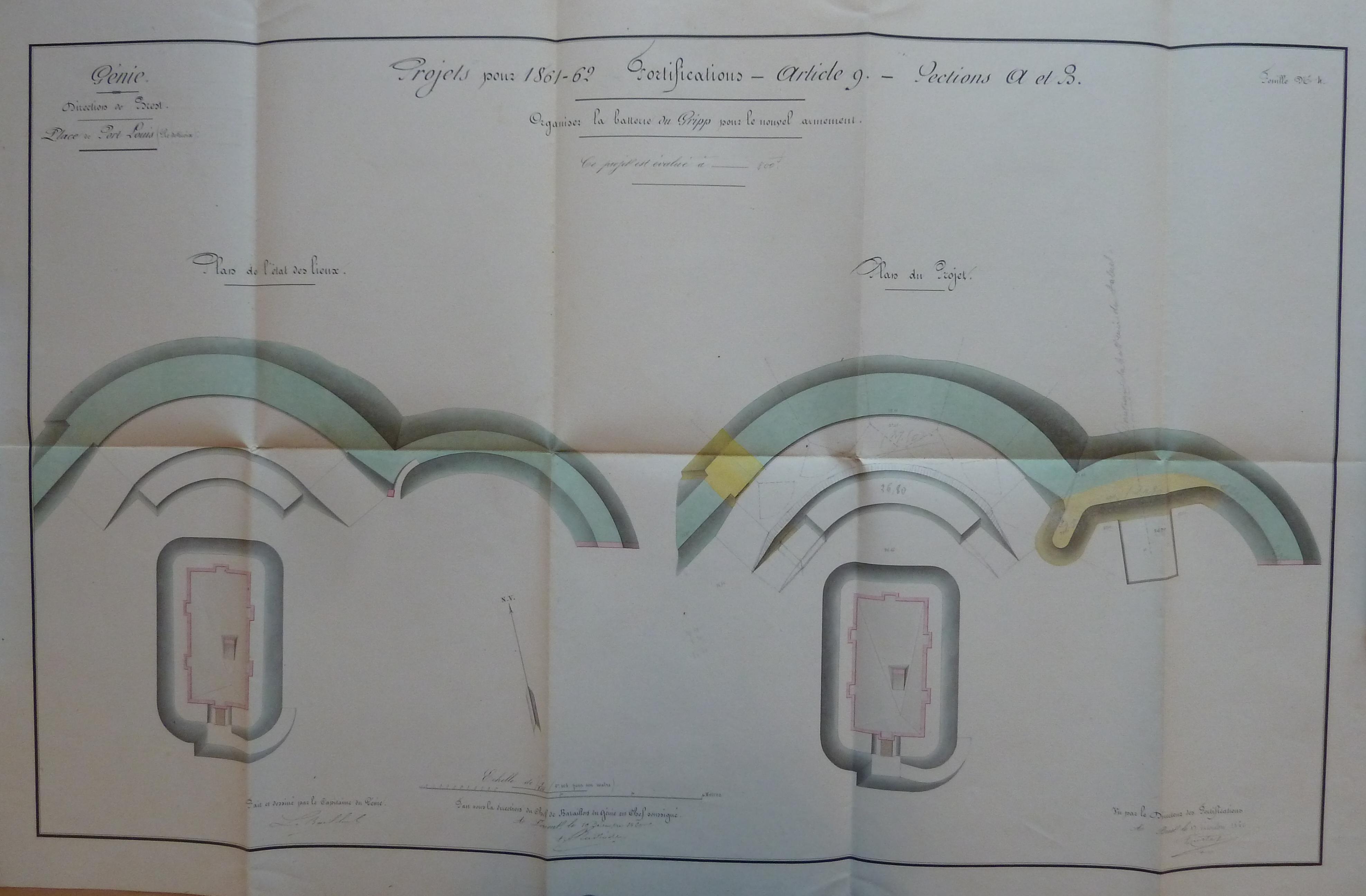 1 VH 1475. Place de Port-Louis, feuille n° 4 des projets pour 1861-1862, organiser la batterie du Gripp pour le nouvel armement, 10 décembre 1860.Immatriculation