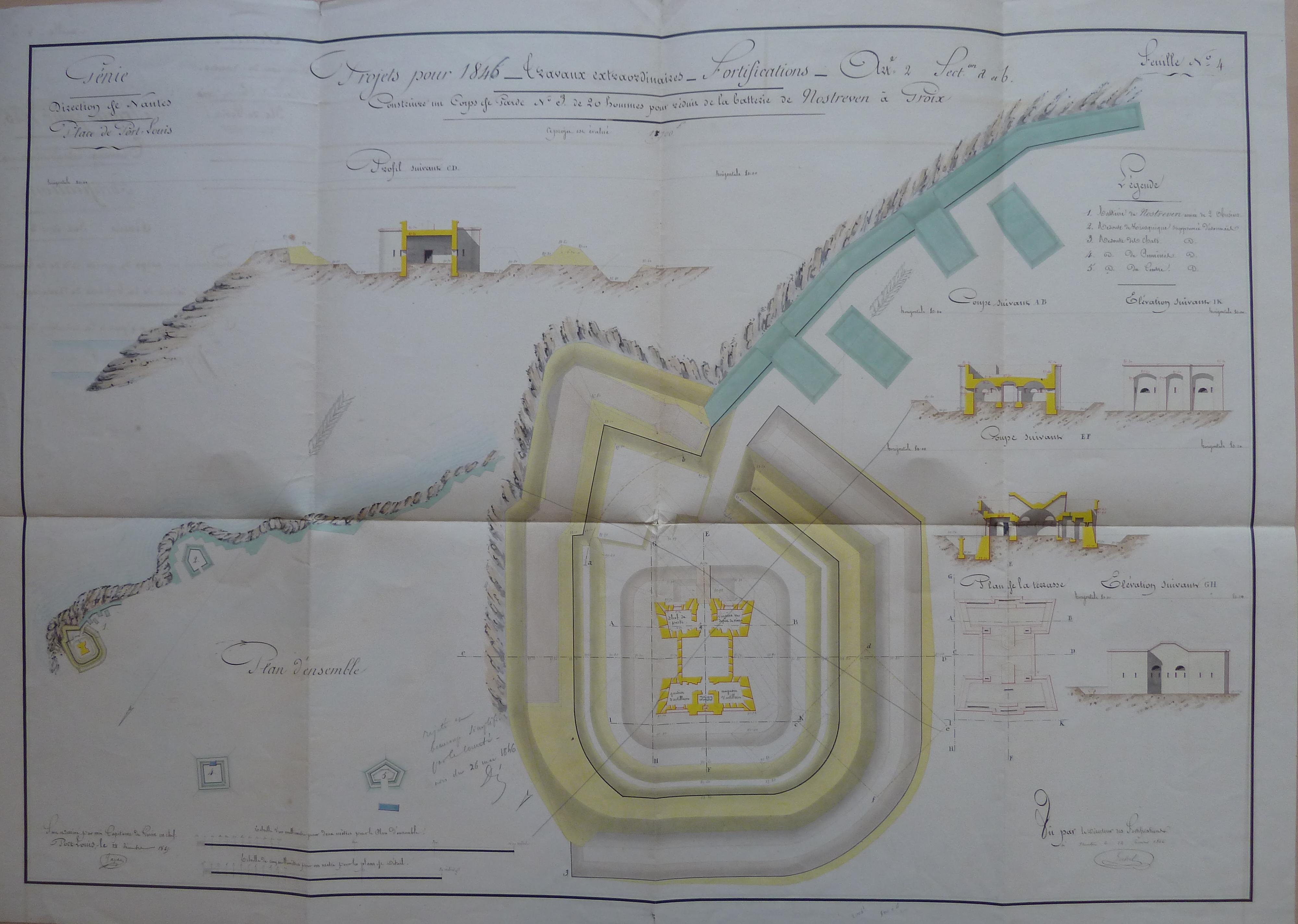 Service historique de la Défense, département Armée de Terre, Vincennes. Archives du Génie ; Article 8, Places françaises et d'Algérie : 1 VH 1473, Place de Port-Louis, projets et dépenses annuels, 1835-1846. Direction du Génie de Nantes, Place de Port-Louis, feuille n° 4 des projets extraordinaires pour 1845, construire un corps de garde n° 3 de 20 hommes pour réduit de la batterie de Nostreven à Groix, 28 décembre 1845.