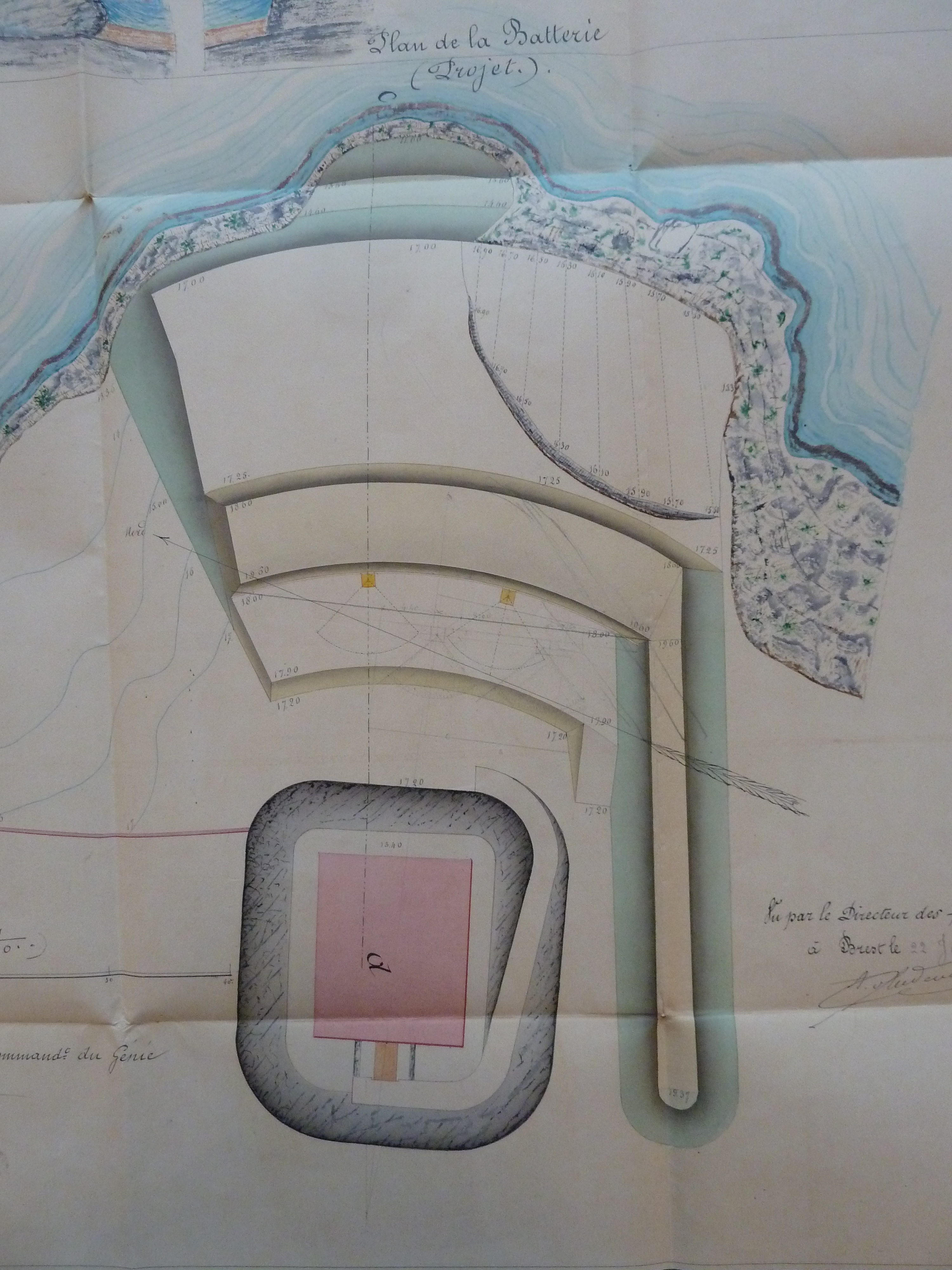 1 VH 1475. Place de Port-Louis, feuille n° 3 des projets supplémentaires pour 1869-1870, reculer la batterie de Nosterven, 30 novembre 1869.Immatriculation