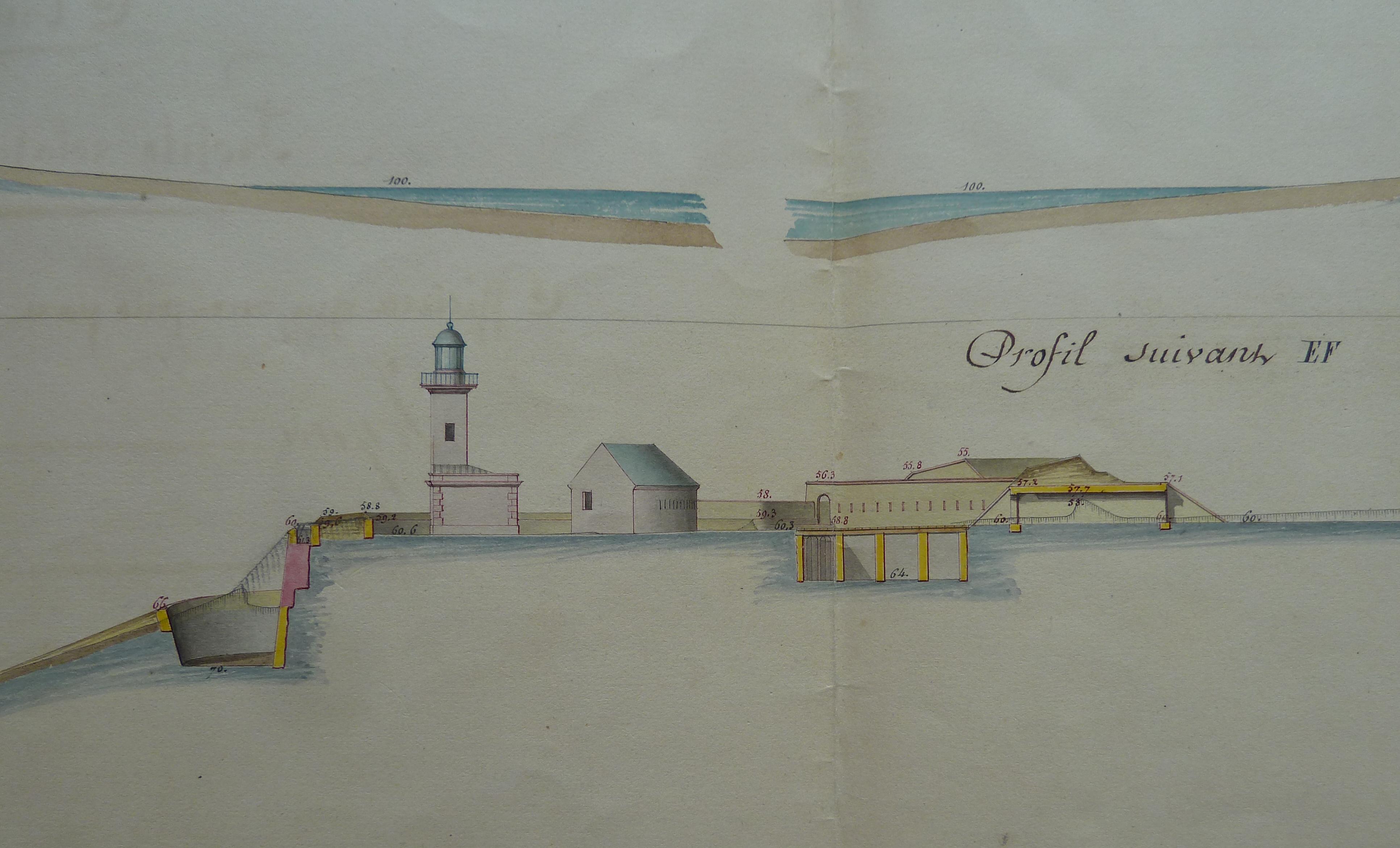 Service historique de la Défense, département Armée de Terre, Vincennes. Archives du Génie ; Article 8, Places françaises et d'Algérie : 1 VH 1473, Place de Port-Louis, projets et dépenses annuels, 1835-1846. Direction du Génie de Nantes, Place de Port-Louis, feuille n° 2 des projets extraordinaires pour 1845, profils relatifs à la feuille n° 1, 24 décembre 1845.