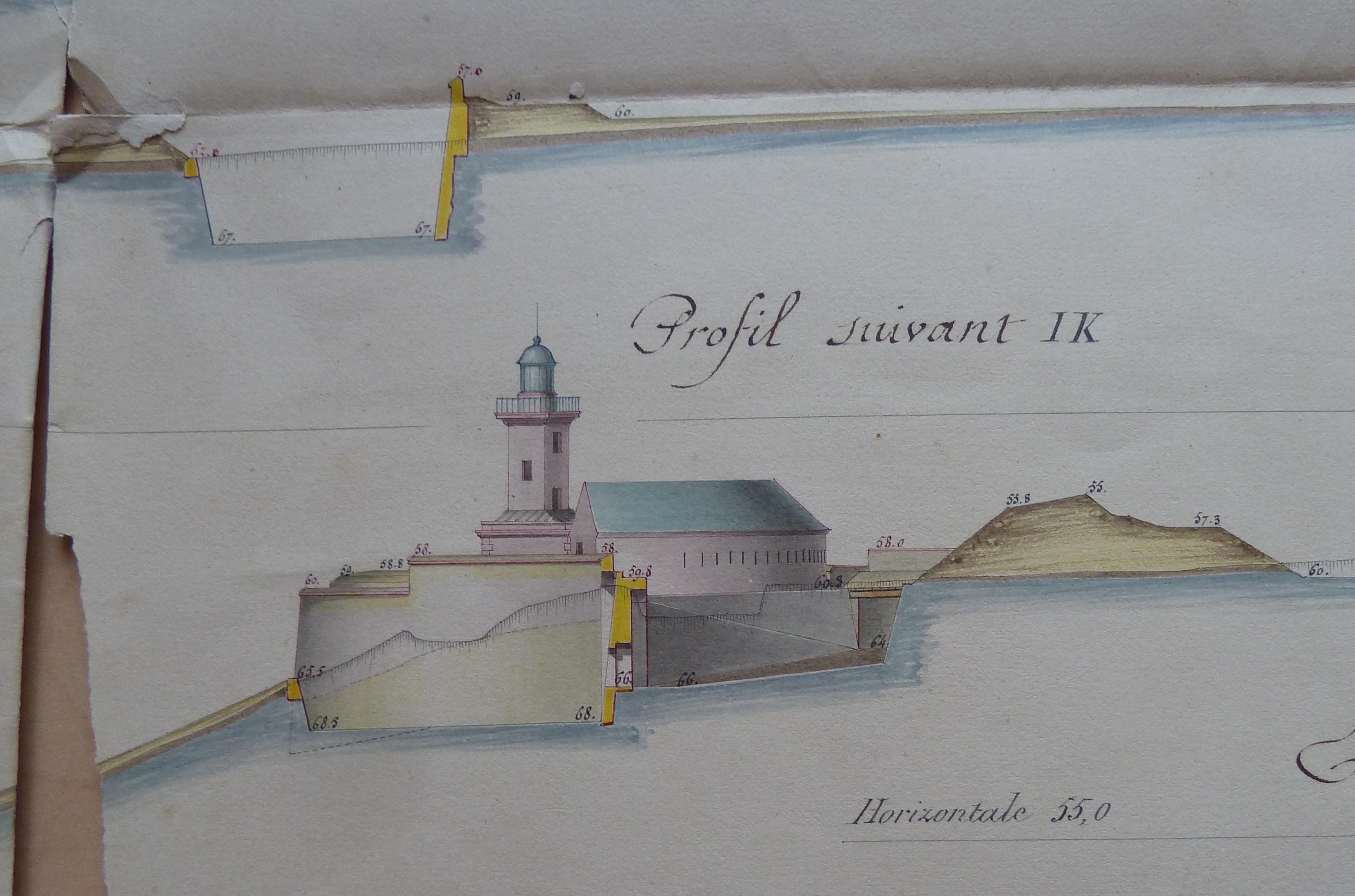 Service historique de la Défense, département Armée de Terre, Vincennes. Archives du Génie ; Article 8, Places françaises et d'Algérie : 1 VH 1473, Place de Port-Louis, projets et dépenses annuels, 1835-1846. Direction du Génie de Nantes, Place de Port-Louis, feuille n° 2 des projets extraordinaires pour 1845, profils relatifs à la feuille n° 1, 24 décembre 1845.