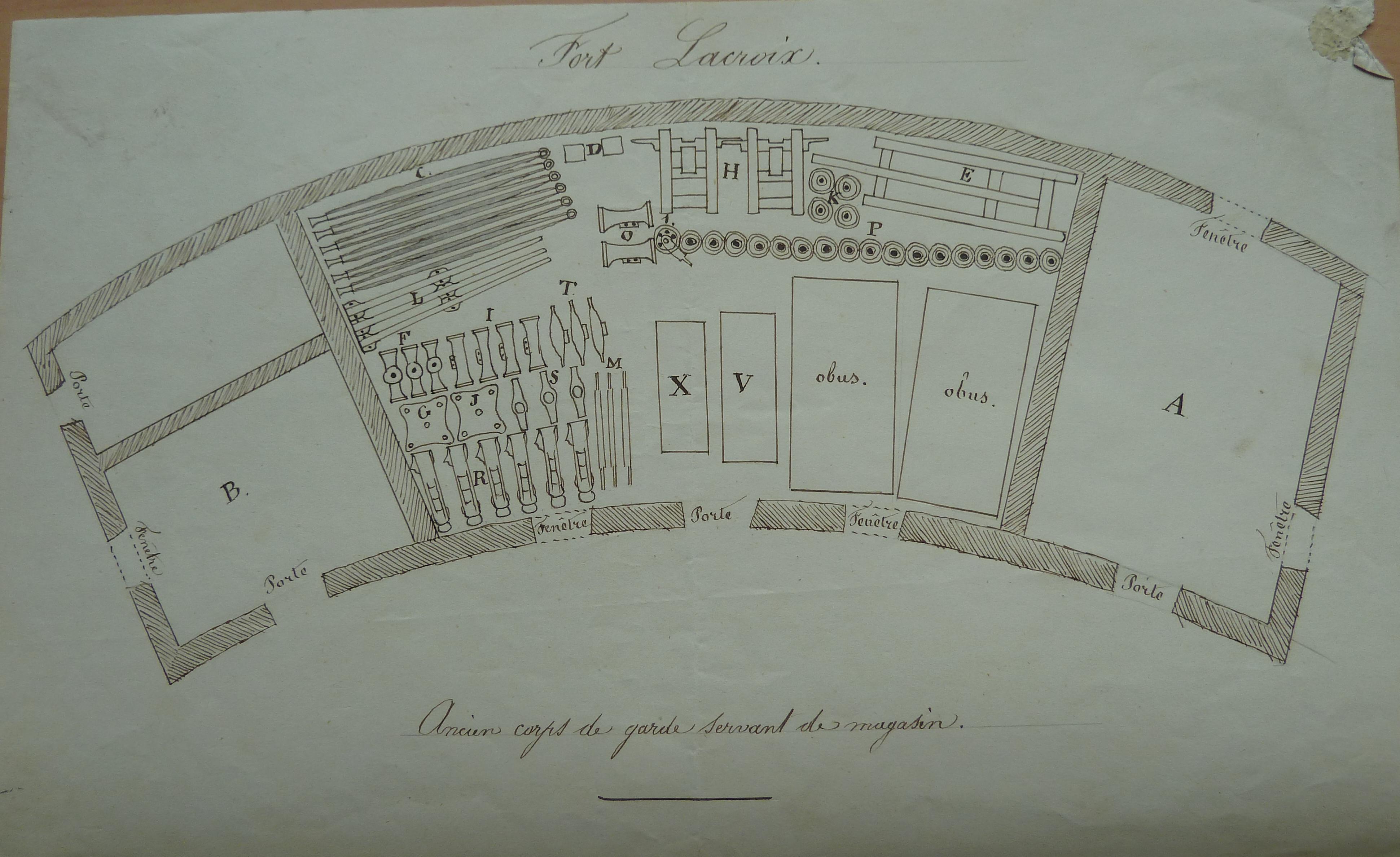 Service historique de la Défense, Département Armée de Terre, Vincennes. Archives de l'Artillerie ; Sous-série 3 W, Opérations militaires : 3 W 56, Direction d'Artillerie de Brest, 1746-1904. Croquis joint au rapport de la direction d'Artillerie de Brest sur les reviremens de matériel dans les batteries de Lorient-Port-Louis, 23 septembre 1854.