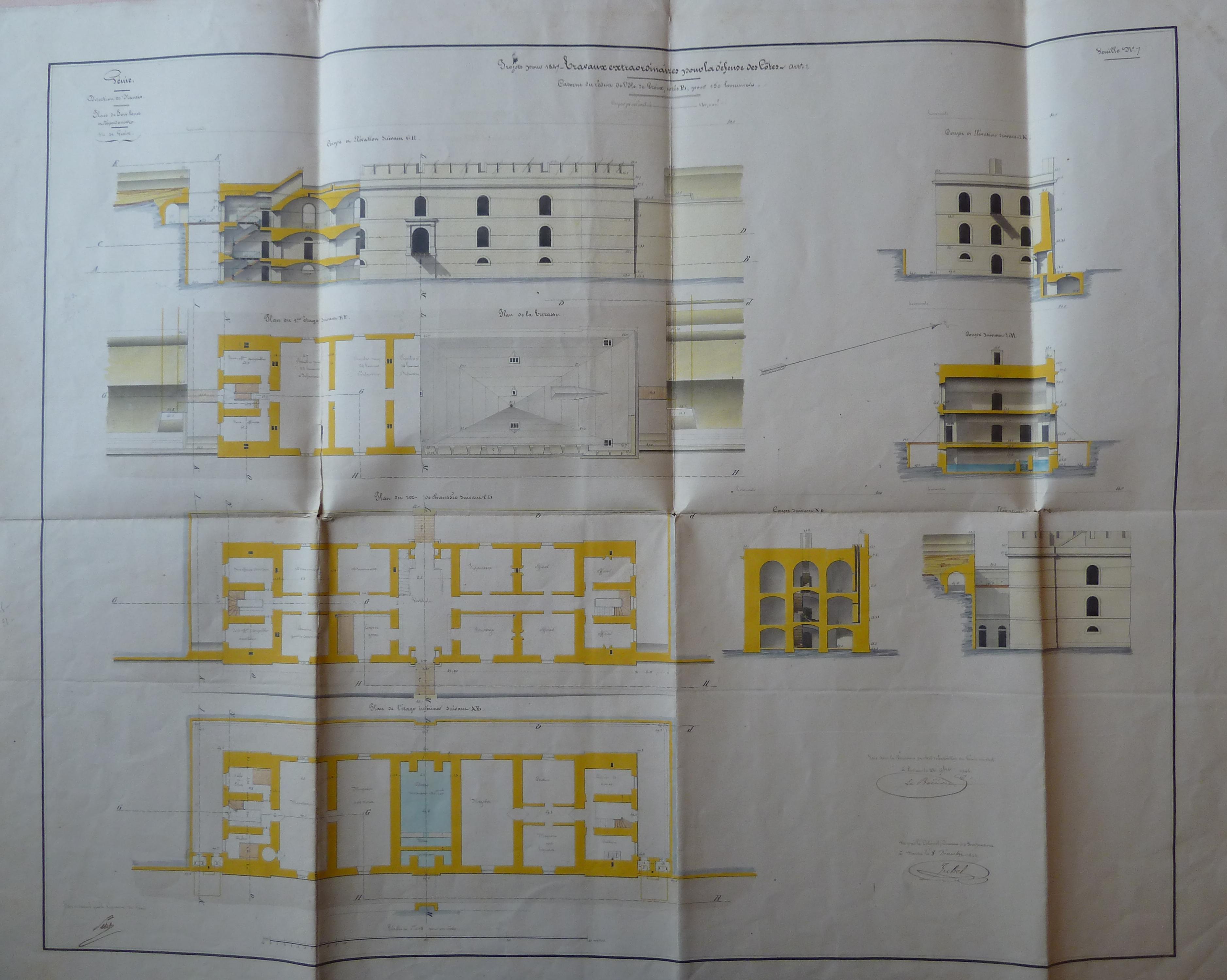 Service historique de la Défense, département Armée de Terre, Vincennes. Archives du Génie ; Article 8, Places françaises et d'Algérie : 1 VH 1474, Place de Port-Louis, projets et dépenses annuels, 1847-1856. Direction du Génie de Nantes, Place de Port-Louis, feuille n° 7 des projets pour 1847, caserne du réduit de l'île de Groix, cotée B, pour 150 hommes, 22 novembre 1846.