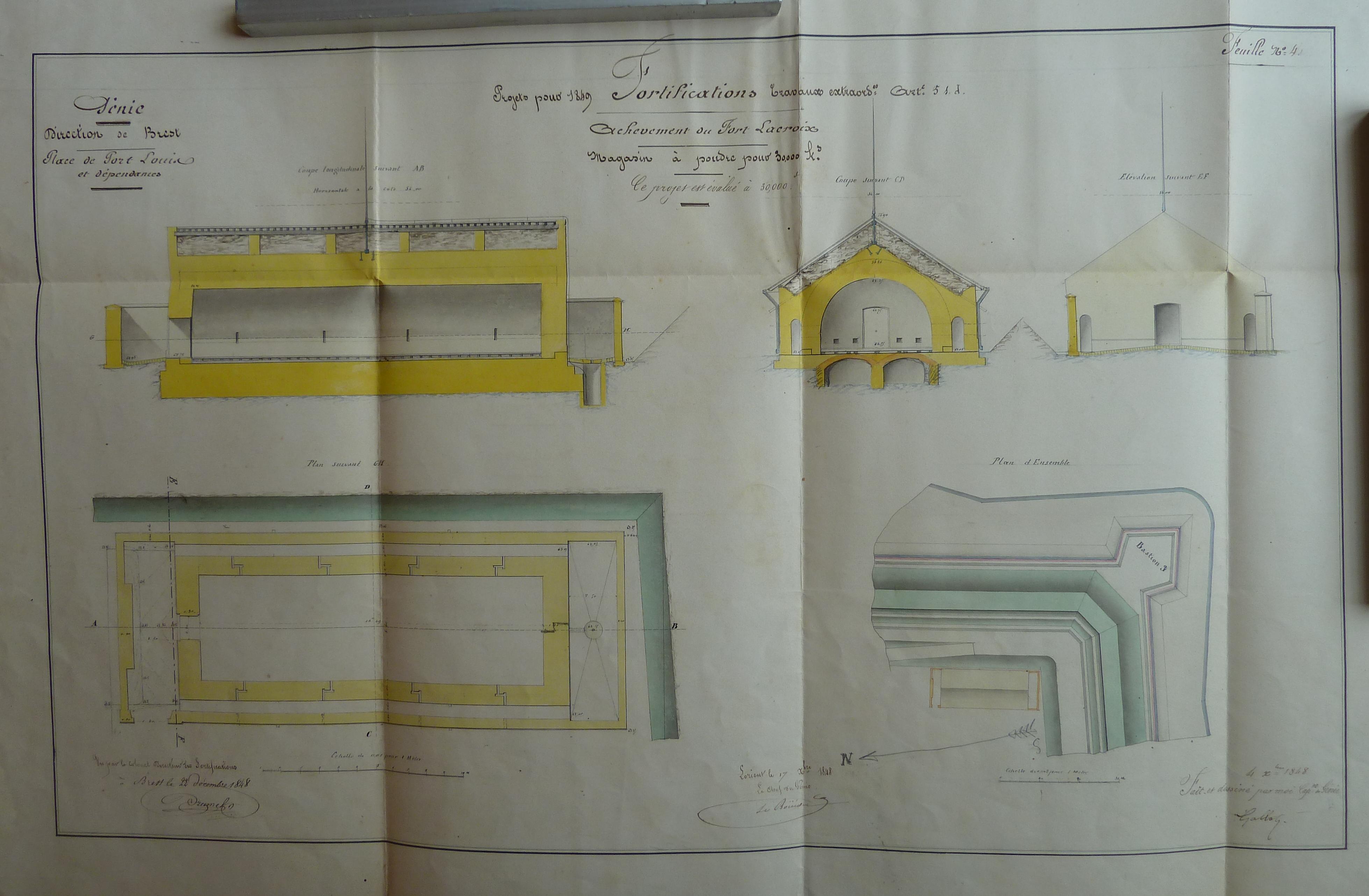 1 VH 1474. Place de Port-Louis, feuille n° 4 des projets pour 1849, achèvement du fort Lacroix, magasin à poudre pour 30000 kg, 17 décembre 1848.Immatriculation