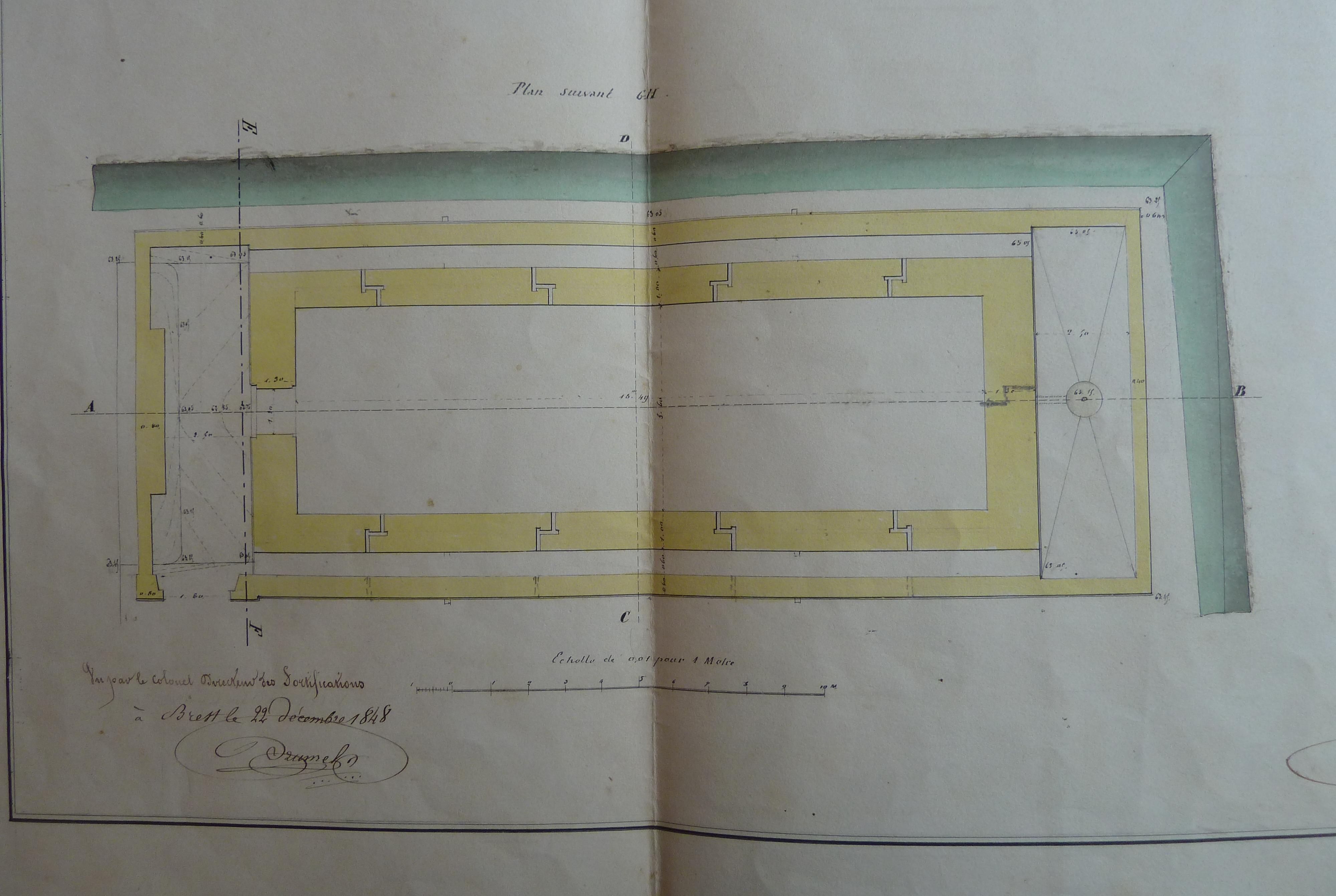 1 VH 1474. Place de Port-Louis, feuille n° 4 des projets pour 1849, achèvement du fort Lacroix, magasin à poudre pour 30000 kg, 17 décembre 1848.Immatriculation
