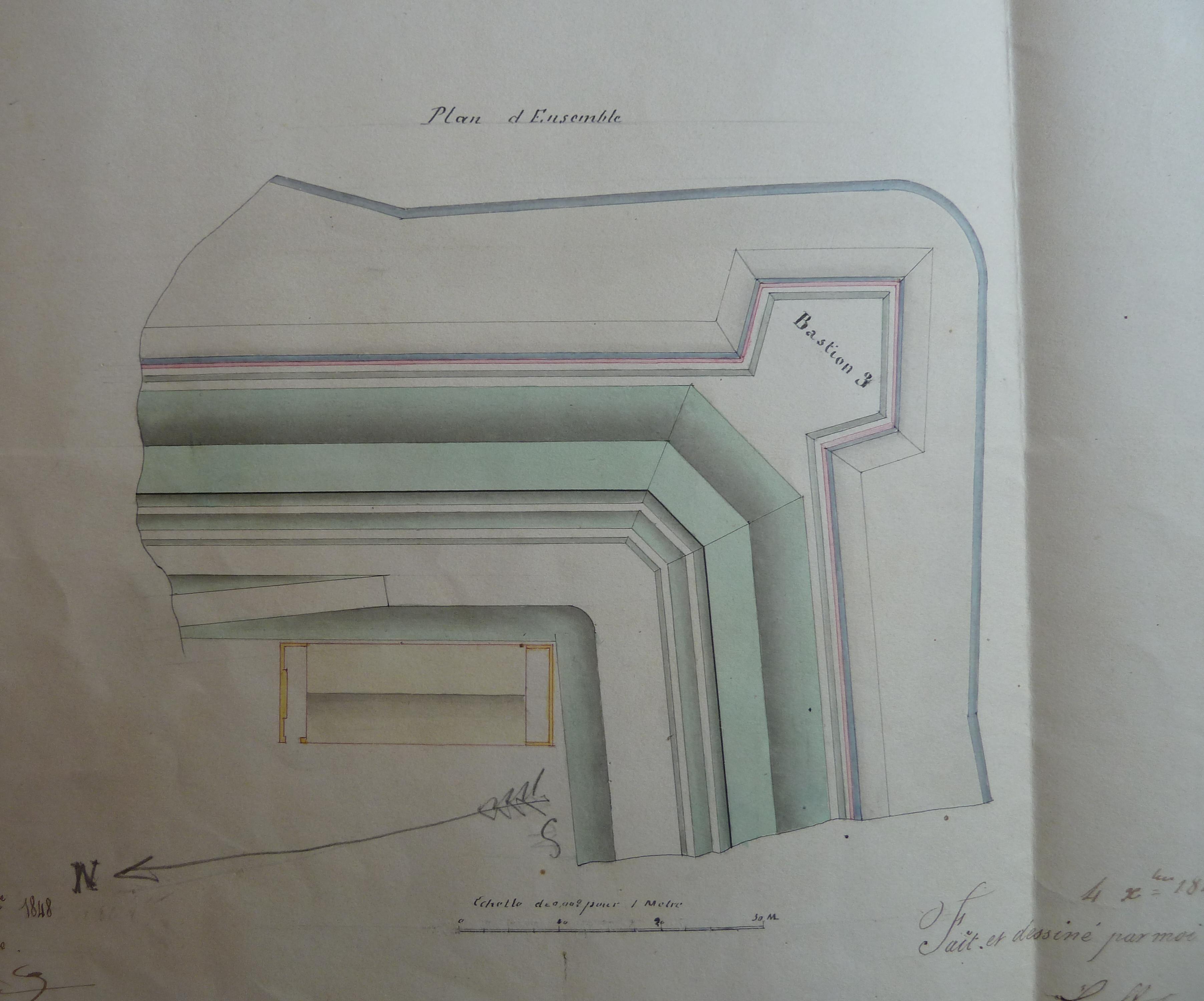 1 VH 1474. Place de Port-Louis, feuille n° 4 des projets pour 1849, achèvement du fort Lacroix, magasin à poudre pour 30000 kg, 17 décembre 1848.Immatriculation