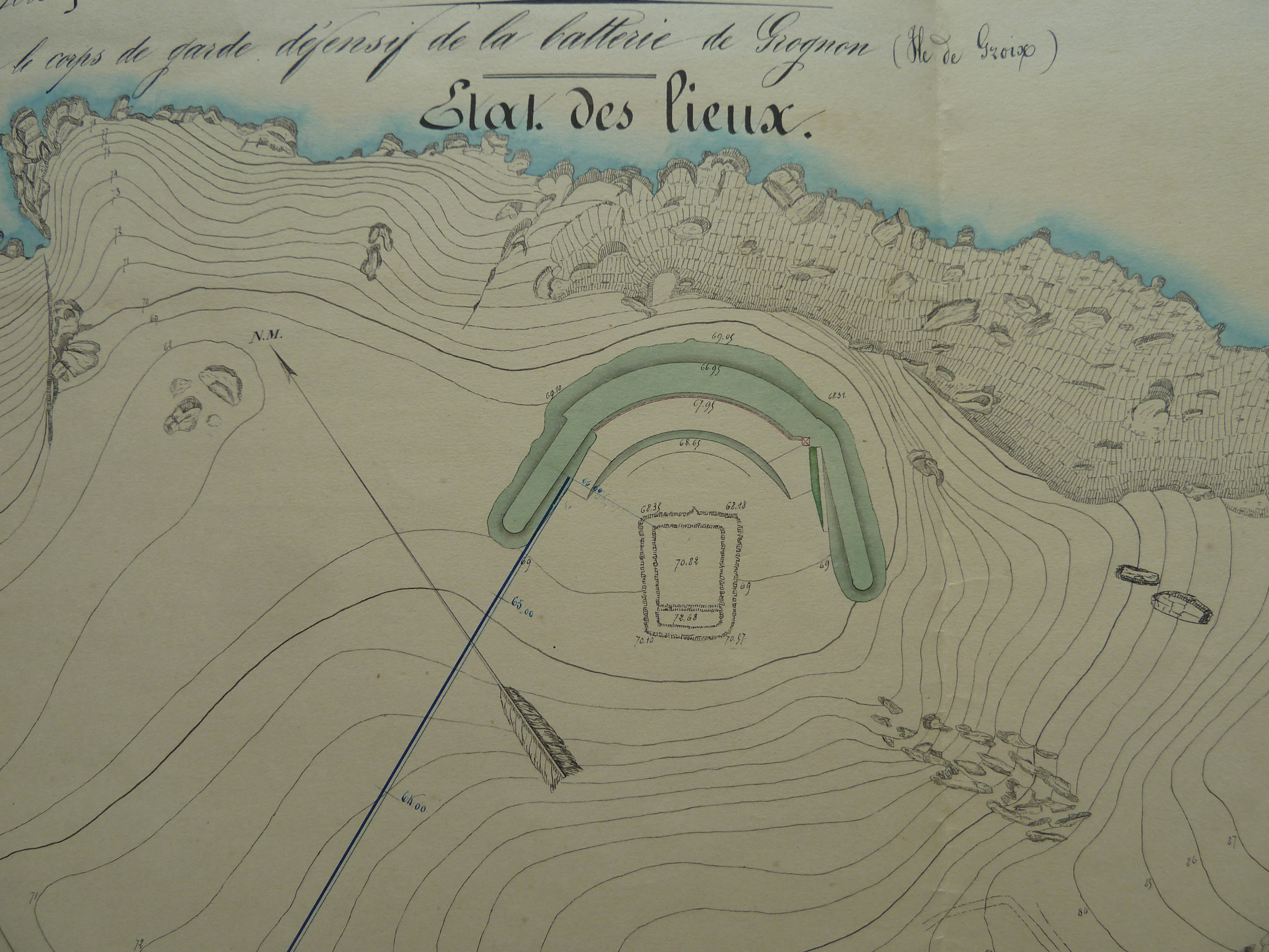 Service historique de la Défense, département Armée de Terre, Vincennes. Archives du Génie ; Article 8, Places françaises et d'Algérie : 1 VH 1474, Place de Port-Louis, projets et dépenses annuels, 1847-1856. Direction du Génie de Nantes, Place de Port-Louis, feuille n° 2 des projets pour 1853-1854, construire le corps de garde défensif de la batterie de Grognon (Ile de Groix), état des lieux, 23 octobre 1852.