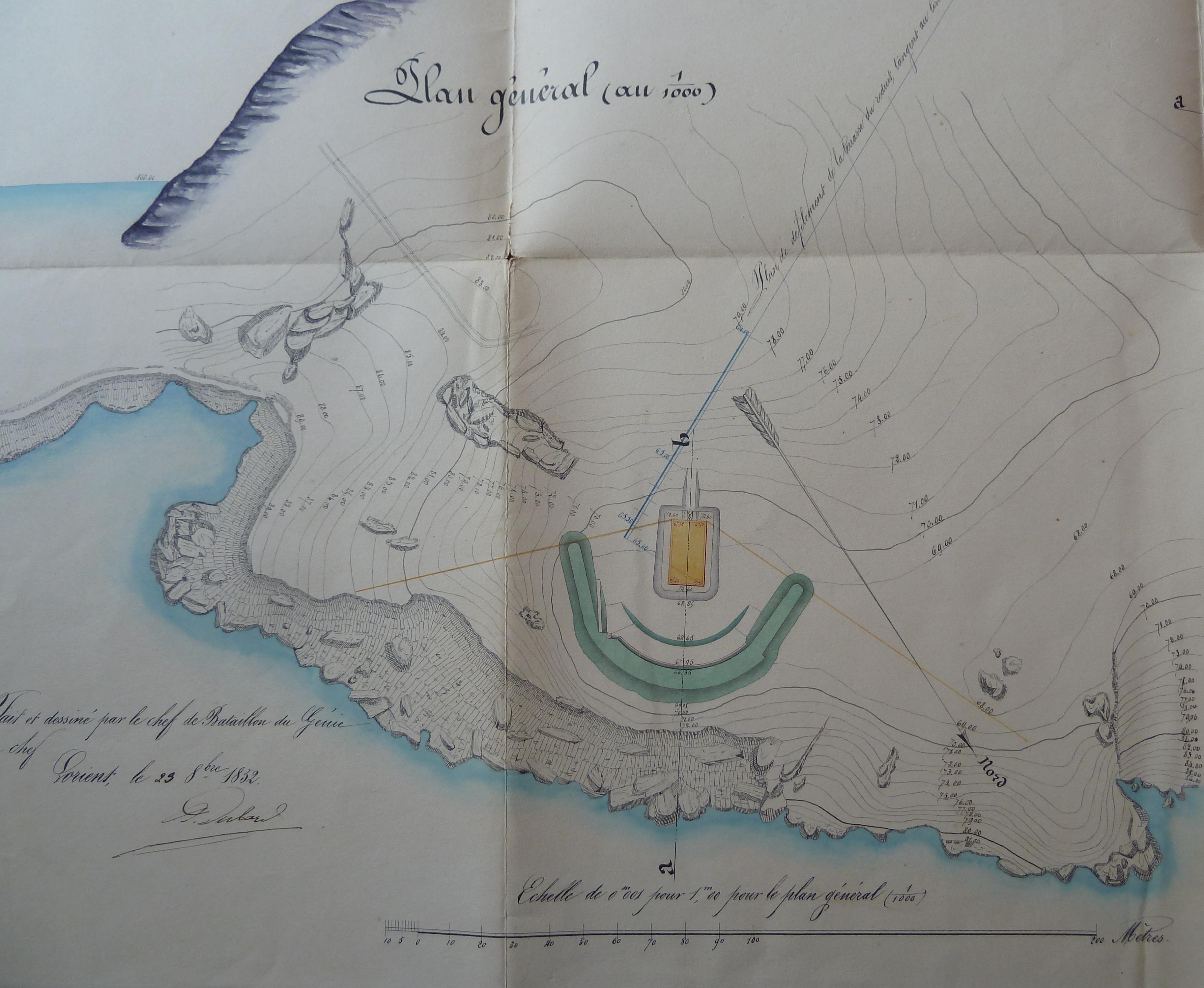 Service historique de la Défense, département Armée de Terre, Vincennes. Archives du Génie ; Article 8, Places françaises et d'Algérie : 1 VH 1474, Place de Port-Louis, projets et dépenses annuels, 1847-1856. Direction du Génie de Nantes, Place de Port-Louis, feuille n° 3 des projets pour 1853-1854, construire le corps de garde défensif de la batterie de Grognon (Ile de Groix), 23 octobre 1852.