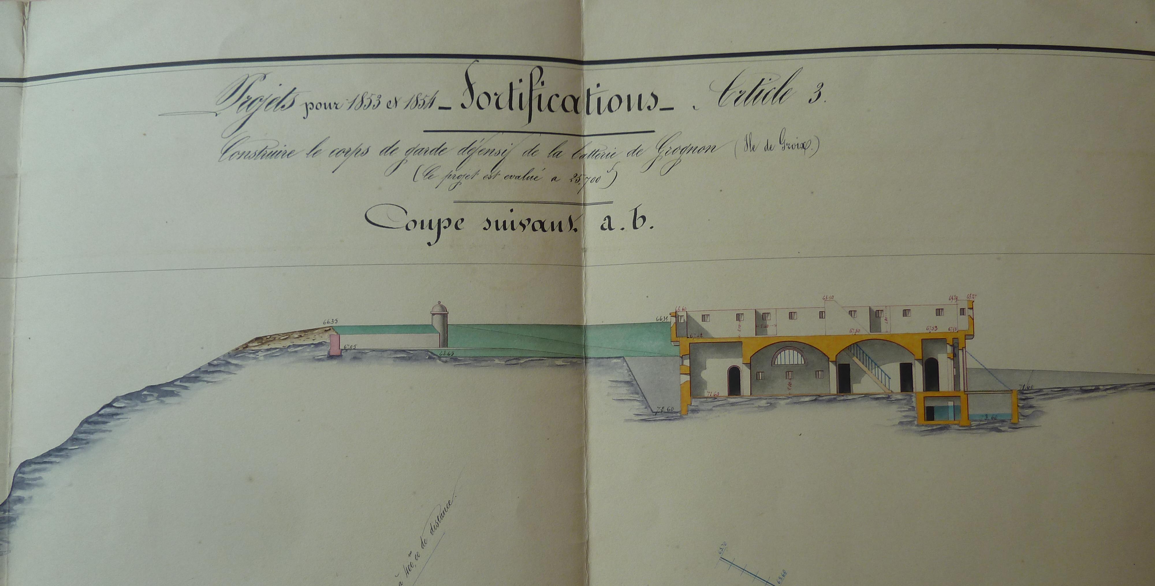 Service historique de la Défense, département Armée de Terre, Vincennes. Archives du Génie ; Article 8, Places françaises et d'Algérie : 1 VH 1474, Place de Port-Louis, projets et dépenses annuels, 1847-1856. Direction du Génie de Nantes, Place de Port-Louis, feuille n° 3 des projets pour 1853-1854, construire le corps de garde défensif de la batterie de Grognon (Ile de Groix), 23 octobre 1852.