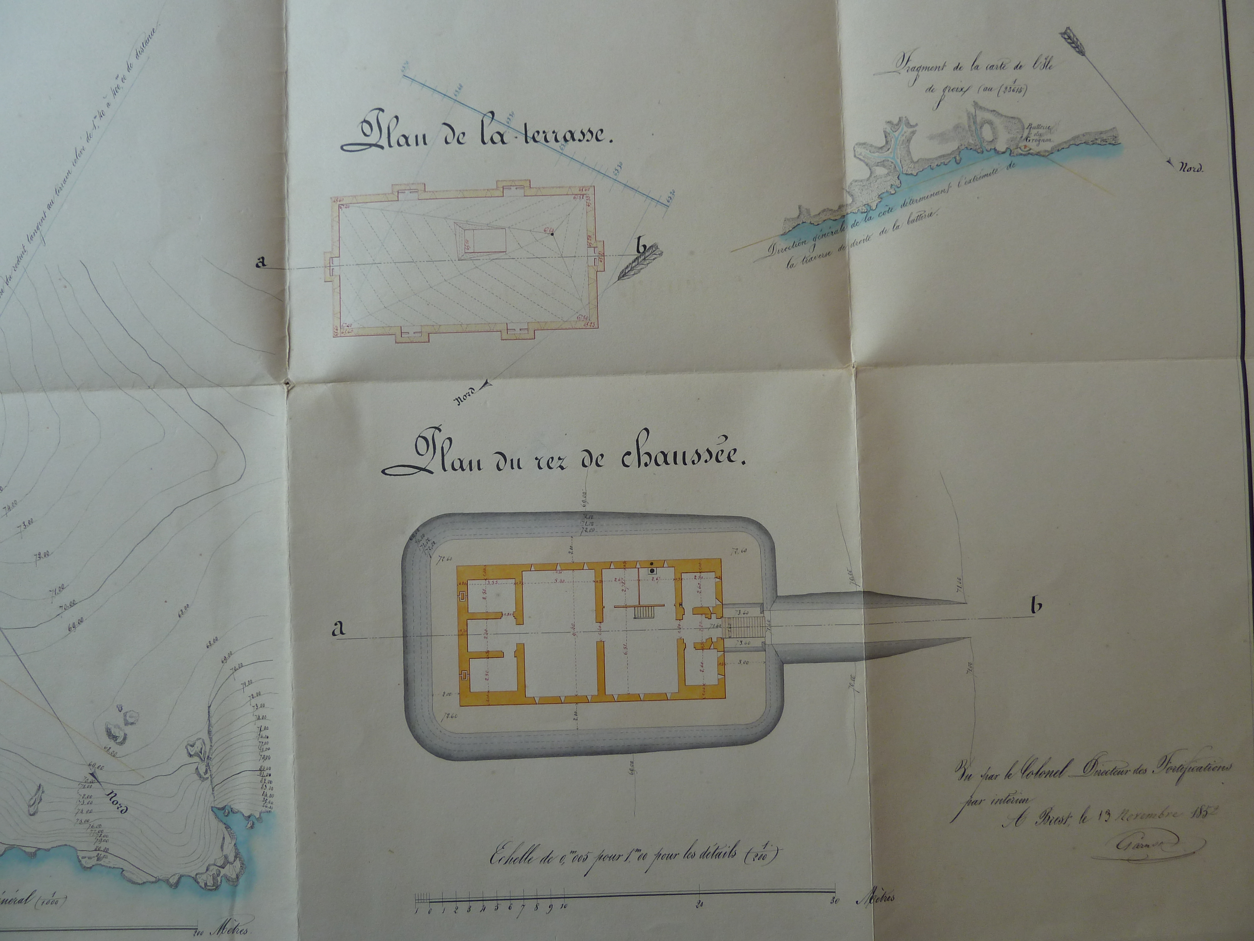 Service historique de la Défense, département Armée de Terre, Vincennes. Archives du Génie ; Article 8, Places françaises et d'Algérie : 1 VH 1474, Place de Port-Louis, projets et dépenses annuels, 1847-1856. Direction du Génie de Nantes, Place de Port-Louis, feuille n° 3 des projets pour 1853-1854, construire le corps de garde défensif de la batterie de Grognon (Ile de Groix), 23 octobre 1852.