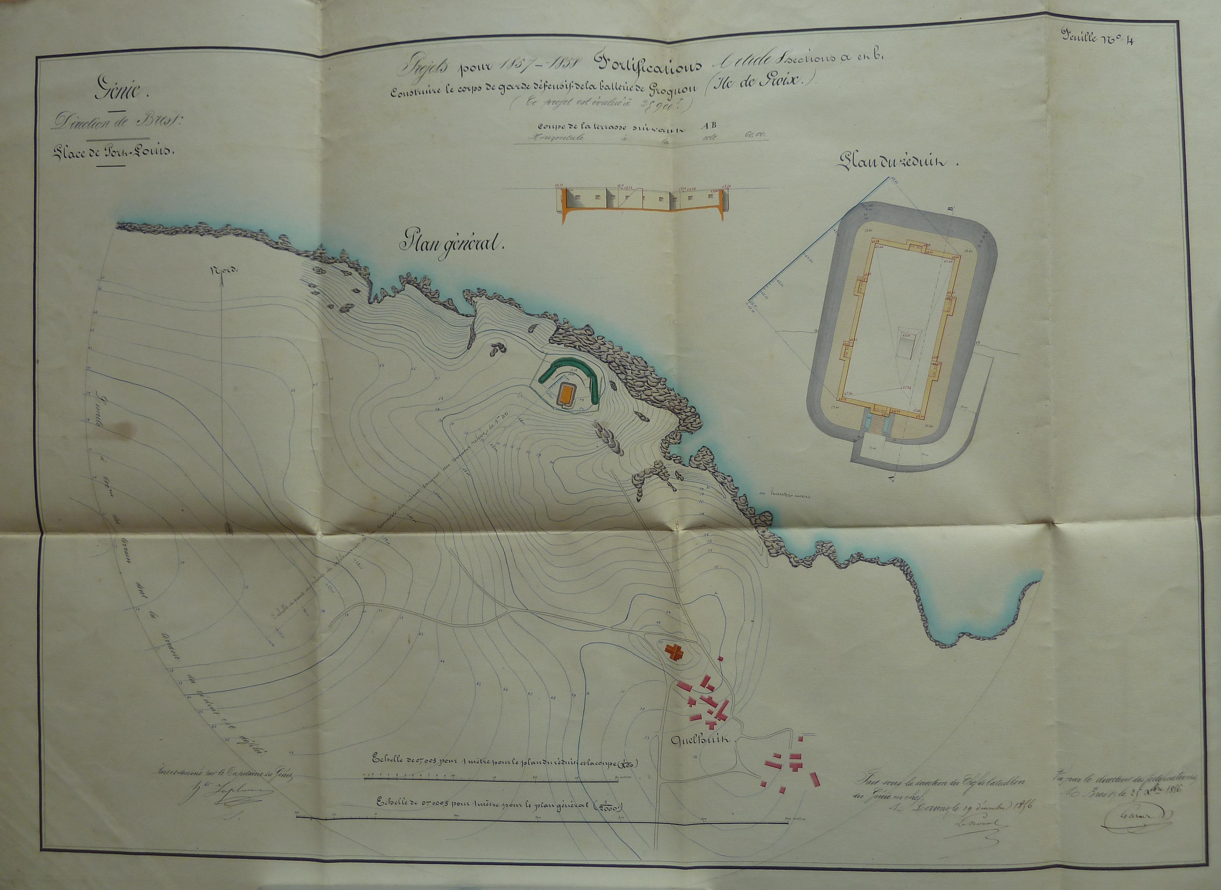 Service historique de la Défense, département Armée de Terre, Vincennes. Archives du Génie ; Article 8, Places françaises et d'Algérie : 1 VH 1475, Place de Port-Louis, projets et dépenses annuels, 1857-1875. Direction du Génie de Brest, Place de Port-Louis, feuille n° 4 des projets pour 1857-1858, construire le corps de garde défensif de la batterie de Grognon (Ile de Groix), 19 décembre 1856