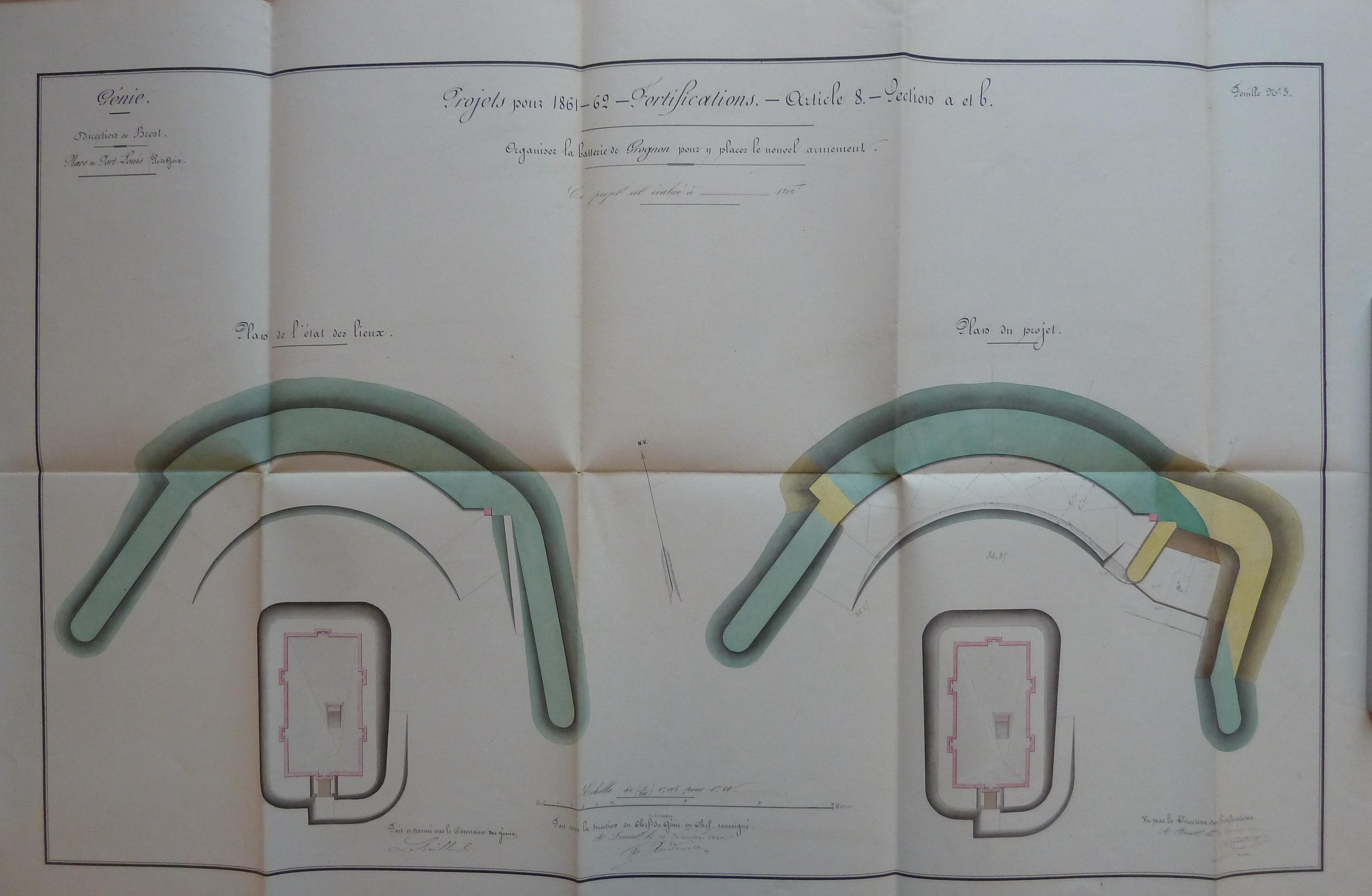 1 VH 1475. Place de Port-Louis, feuille n° 3 des projets pour 1861-1862, organiser la batterie de Grognon pour y placer le nouvel armement, 10 décembre 1860.Immatriculation