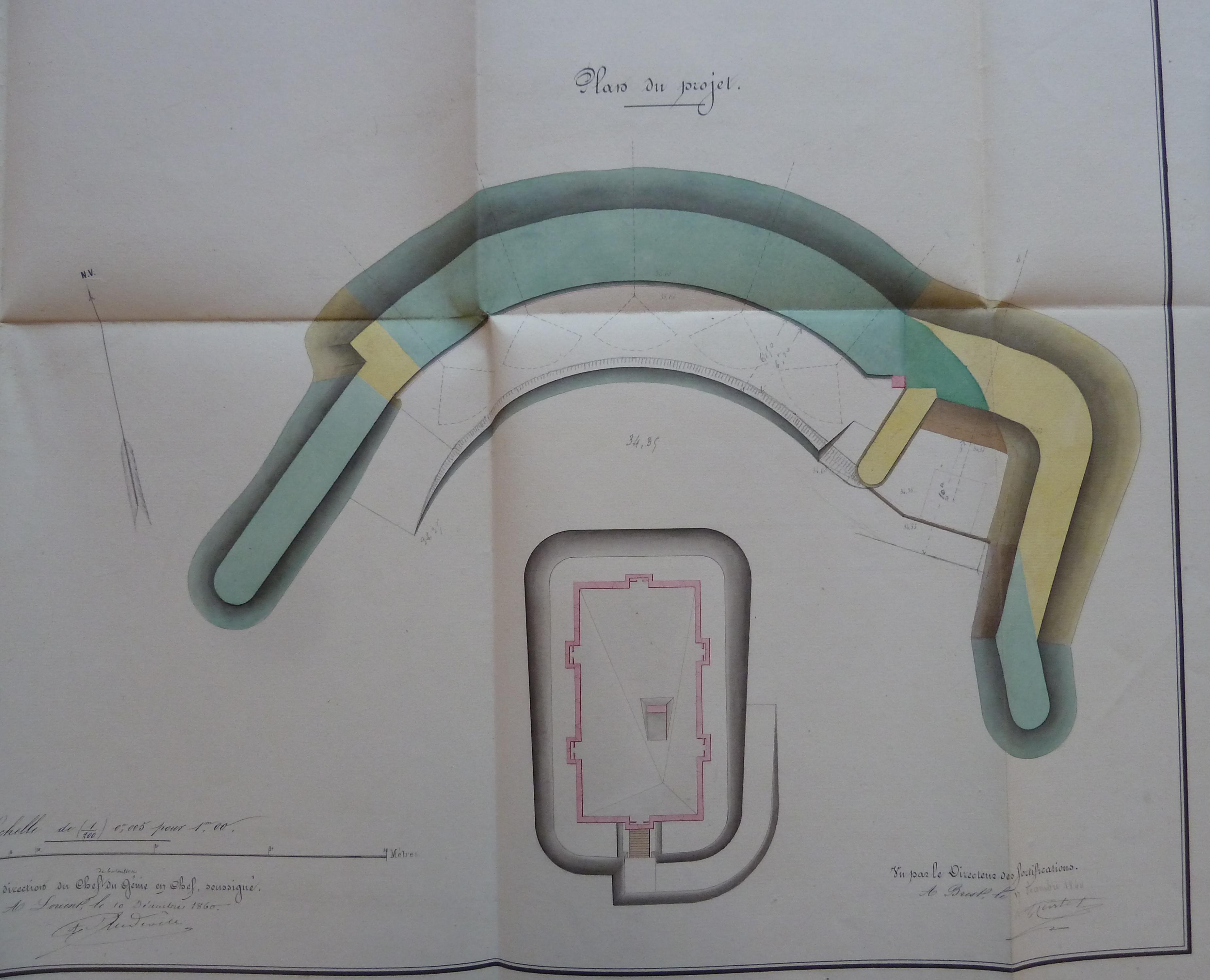 Service historique de la Défense, département Armée de Terre, Vincennes. Archives du Génie ; Article 8, Places françaises et d'Algérie : 1 VH 1475, Place de Port-Louis, projets et dépenses annuels, 1857-1875. Direction du Génie de Brest, Place de Port-Louis, feuille n° 3 des projets pour 1861-1862, organiser la batterie de Grognon pour y placer le nouvel armement, 10 décembre 1860.