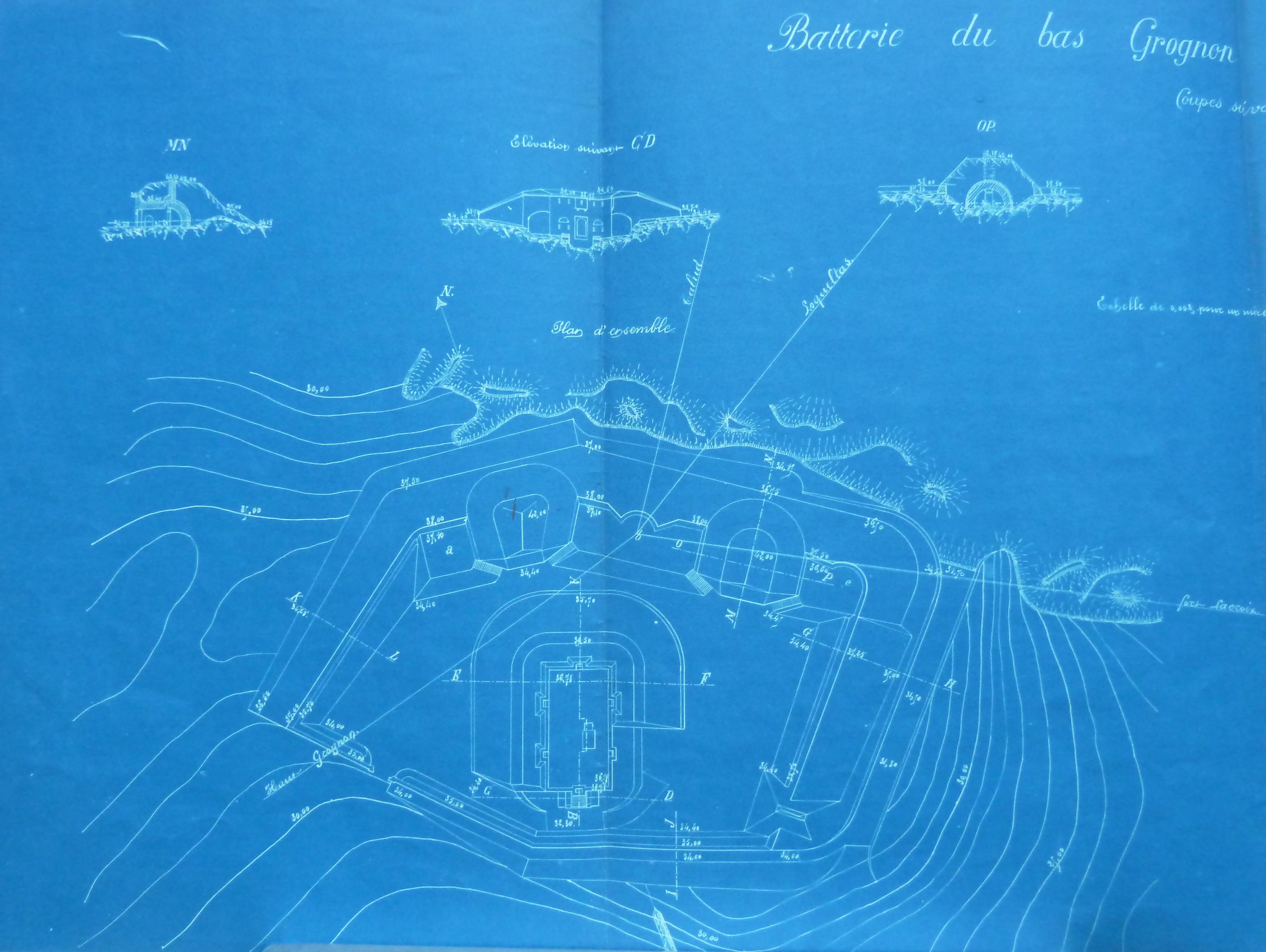 Service historique de la Défense, Département Armée de Terre, Vincennes. Archives de la Guerre, Troisième République ; Sous-série 7 N, Etat-Major de l'Armée : 7 N 1905, Défense des fronts de mer, dossiers de l’inspection générale permanente d’armement des côtes - Atlantique : pièces collectives, Fort Médoc, Fort Paté, La Rochelle, embouchure de laLoire, Lorient, Nantes, Quiberon, Rochefort, Iles d’Aix et d’Oléron, Saint-Nazaire (1878-1898), Iles de Groix, d’Ouessant et de Ré (1887-1907). Croquis joint au procès-verbal de conférence du 20 février 1892, batterie du Bas Grognon, état des lieux.