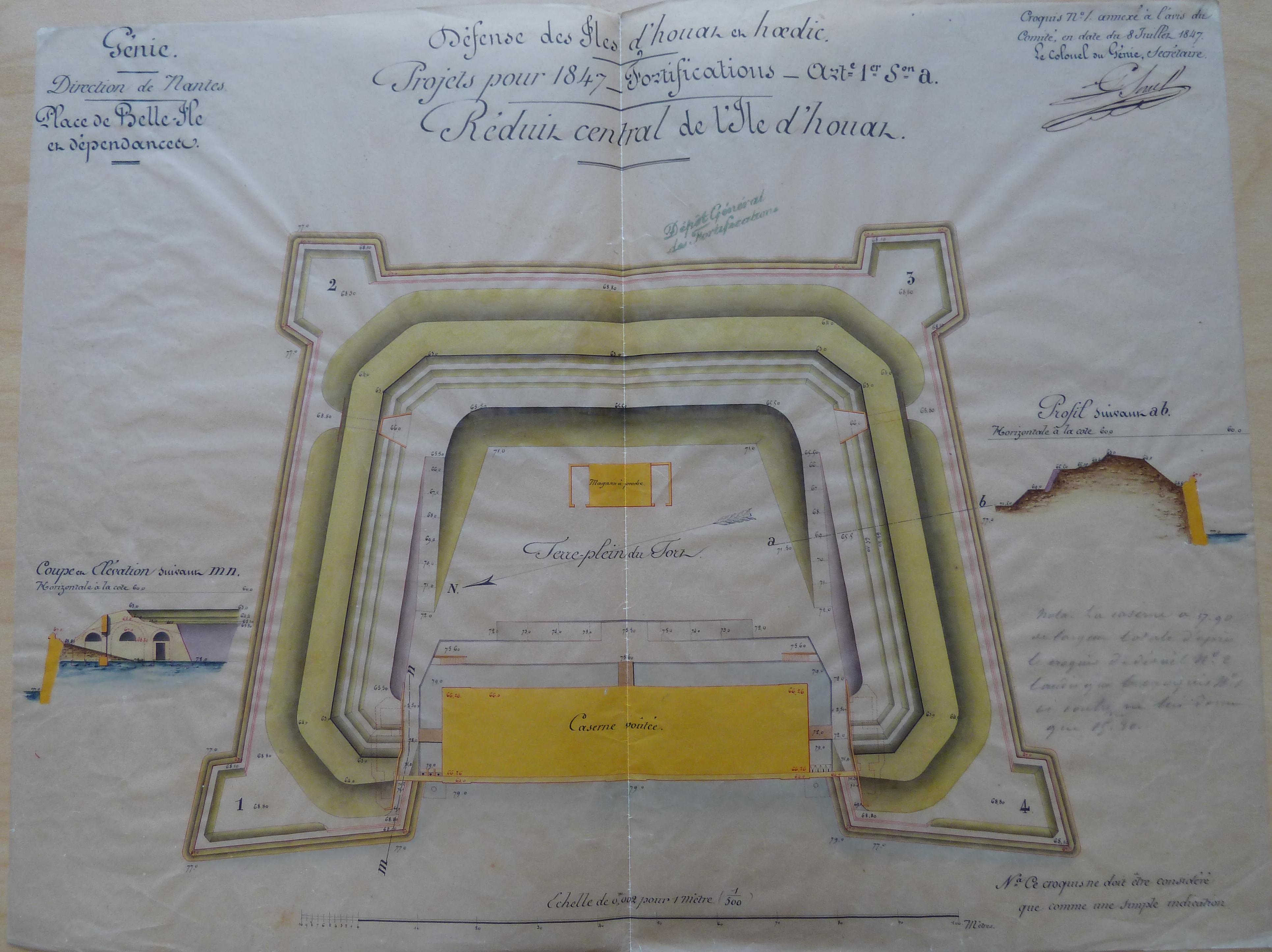 Service historique de la Défense, département Armée de Terre, Vincennes. Archives du Génie ; Article 12, Avis du Comité : 1 VK 534, Croquis annexés aux avis du Comité, Bellegarde, Belle-Île-en-Mer, Bergues (1818-1885). Croquis n° 1 annexé à l'avis du Comité en date du 8 juillet 1847, réduit central de l'Ile d'Houat.