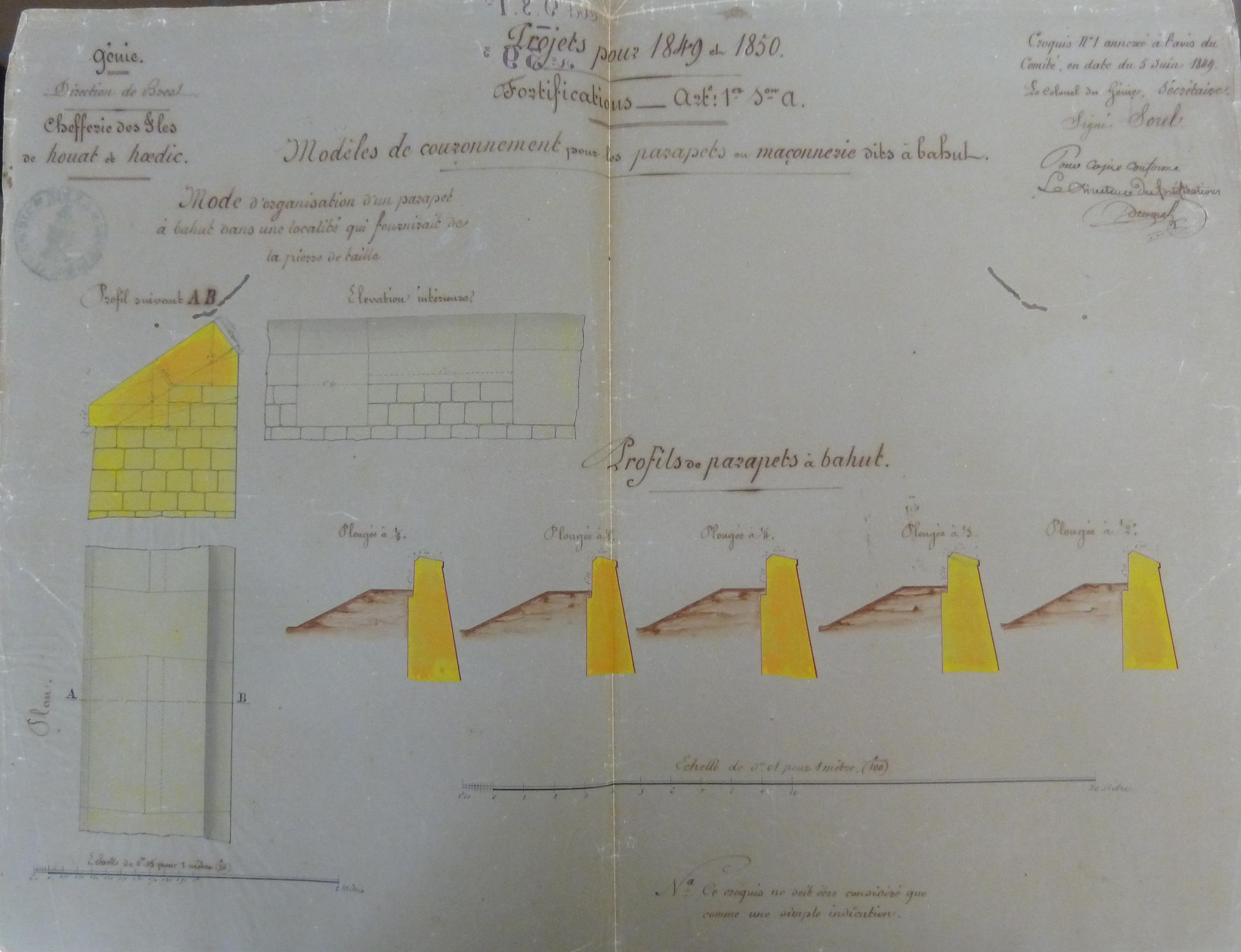 Service historique de la Défense, Département Marine, Lorient. Archives de la Place et du Génie de Belle-Île-en-Mer ; Sous-série 4 S3, archives de la Place de Houat-Hoedic : 4 S3 3, documents en provenance du Comité des fortifications. Croquis n° 1 annexé à l'avis du Comité en date du 5 juin 1849, modèles de couronnement pour les parapets en maçonnerie dits à bahut.
